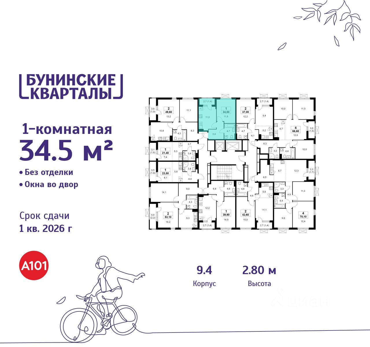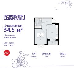 Продается однокомнатная квартира 1006 в новостройке ЖК "Бунинские кварталы" по адресу Москва, ТиНАО, Новомосковский АО, Сосенское С/П, жилой комплекс Бунинские Кварталы, 9.4, район Коммунарка, Новомосковский административный округ, Москва. Общая площадь квартиры - 34.50 кв. м., этаж 19 из 19, секция 10. Тип проекта, по которому построен дом - монолит, компания-застройщик - ООО "А101". Стоимость квартиры - 13144500 Р. Срок сдачи - 1 квартал 2026.