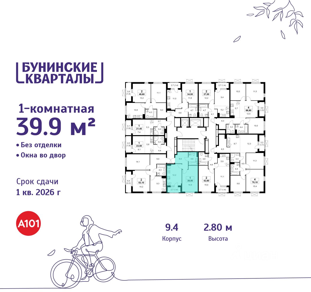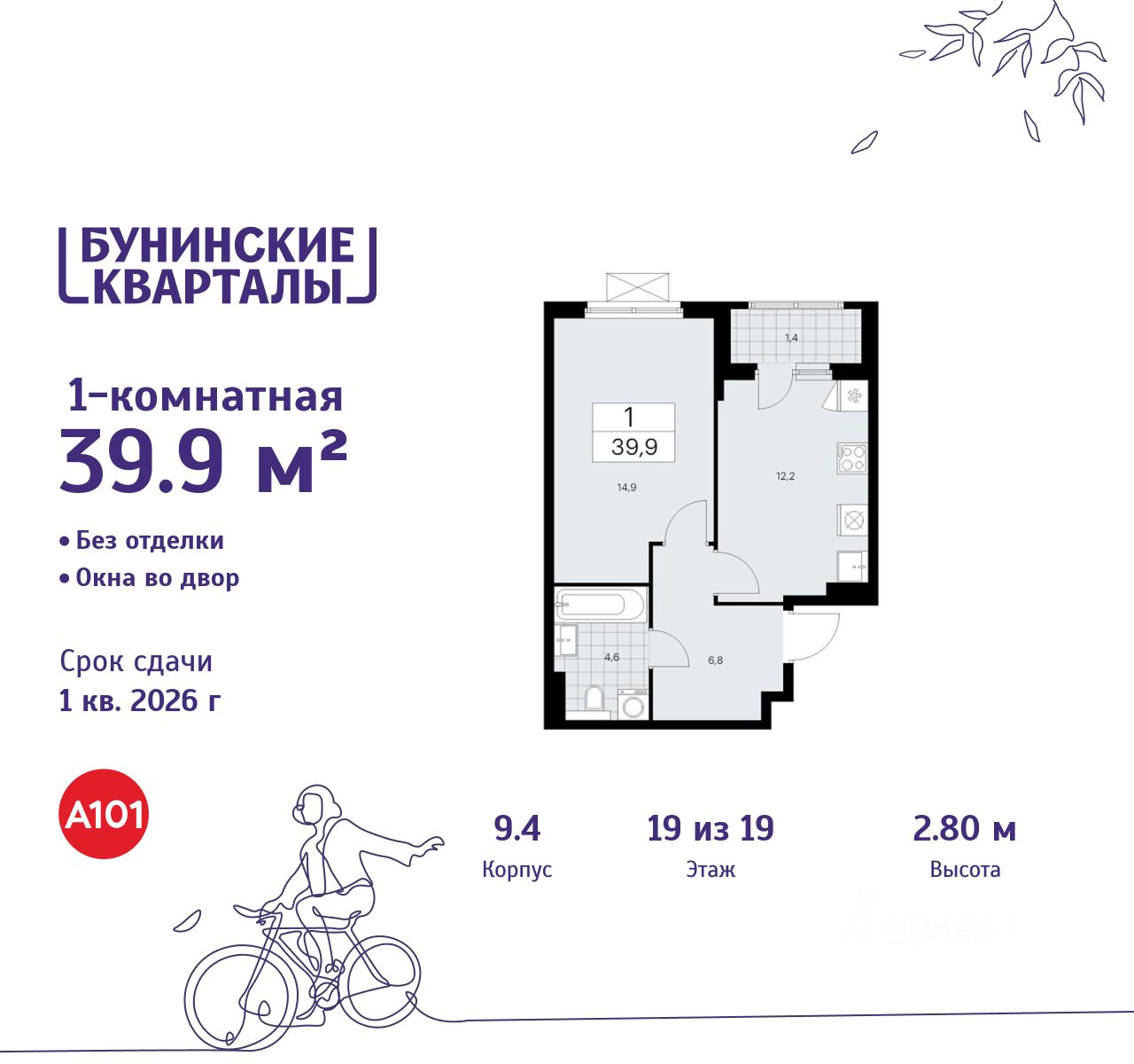 Продается однокомнатная квартира 1001 в новостройке ЖК "Бунинские кварталы" по адресу Москва, ТиНАО, Новомосковский АО, Сосенское С/П, жилой комплекс Бунинские Кварталы, 9.4, район Коммунарка, Новомосковский административный округ, Москва. Общая площадь квартиры - 39.90 кв. м., этаж 19 из 19, секция 10. Тип проекта, по которому построен дом - монолит, компания-застройщик - ООО "А101". Стоимость квартиры - 14966889 Р. Срок сдачи - 1 квартал 2026.