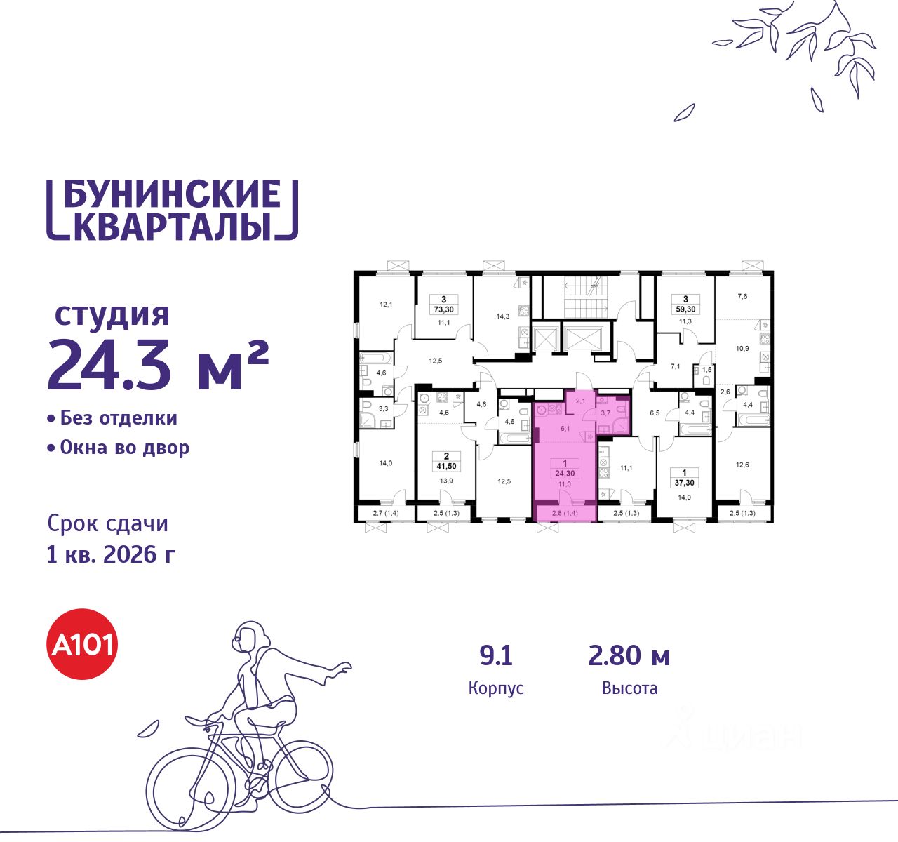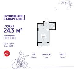 Продается студия 432 в новостройке ЖК "Бунинские кварталы" по адресу Москва, ТиНАО, Новомосковский АО, Сосенское С/П, жилой комплекс Бунинские Кварталы, 9.1, район Коммунарка, Новомосковский административный округ, Москва. Общая площадь квартиры - 24.30 кв. м., этаж 19 из 19, секция 6. Тип проекта, по которому построен дом - монолит, компания-застройщик - ООО "А101". Стоимость квартиры - 10833912 Р. Срок сдачи - 1 квартал 2026.