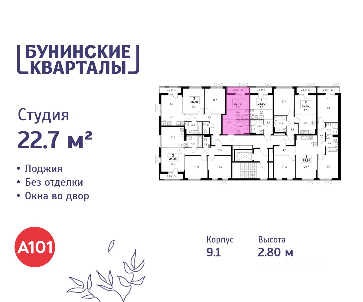Продается студия 27 в новостройке ЖК "Бунинские кварталы" по адресу Москва, ТиНАО, Новомосковский АО, Сосенское С/П, жилой комплекс Бунинские Кварталы, 9.1, район Коммунарка, Новомосковский административный округ, Москва. Общая площадь квартиры - 22.70 кв. м., этаж 6 из 9, секция 1. Тип проекта, по которому построен дом - монолит, компания-застройщик - ООО "А101". Стоимость квартиры - 10067223 Р. Срок сдачи - 2 квартал 2026.