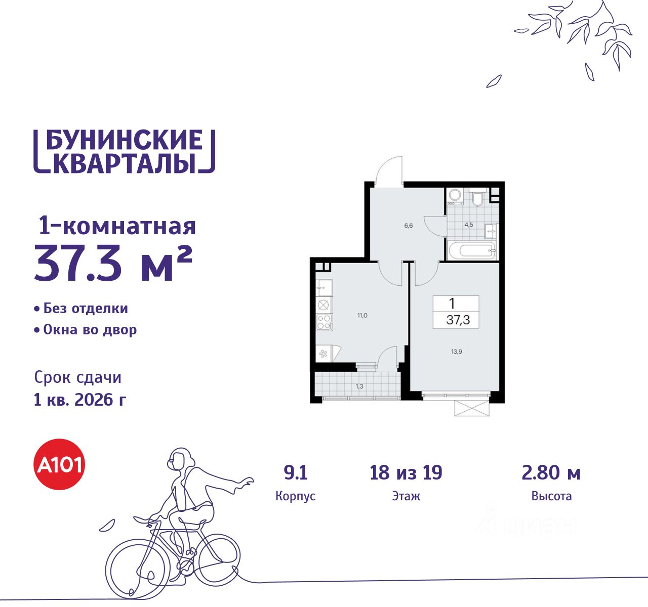 Продается однокомнатная квартира 426 в новостройке ЖК "Бунинские кварталы" по адресу Москва, ТиНАО, Новомосковский АО, Сосенское С/П, жилой комплекс Бунинские Кварталы, 9.1, район Коммунарка, Новомосковский административный округ, Москва. Общая площадь квартиры - 37.30 кв. м., этаж 18 из 19, секция 6. Тип проекта, по которому построен дом - монолит, компания-застройщик - ООО "А101". Стоимость квартиры - 13531321 Р. Срок сдачи - 1 квартал 2026.