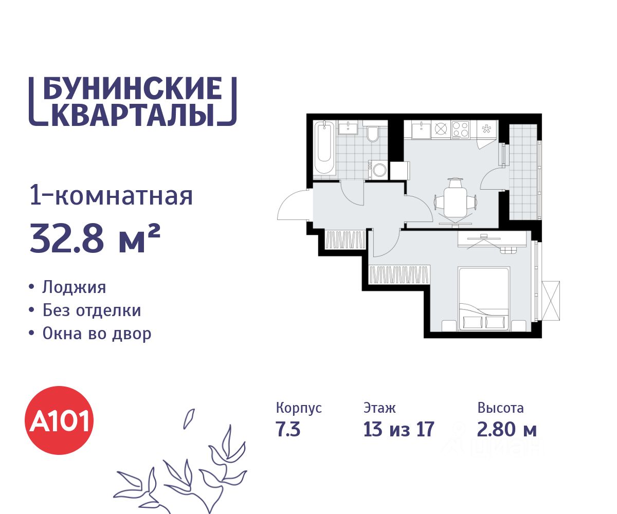 Продается однокомнатная квартира 742 в новостройке ЖК "Бунинские кварталы" по адресу Москва, ТиНАО, Новомосковский АО, Сосенское С/П, жилой комплекс Бунинские Кварталы, 7.3, район Коммунарка, Новомосковский административный округ, Москва. Общая площадь квартиры - 32.80 кв. м., этаж 13 из 17, секция 10. Тип проекта, по которому построен дом - монолит, компания-застройщик - ООО "А101". Стоимость квартиры - 12868752 Р.