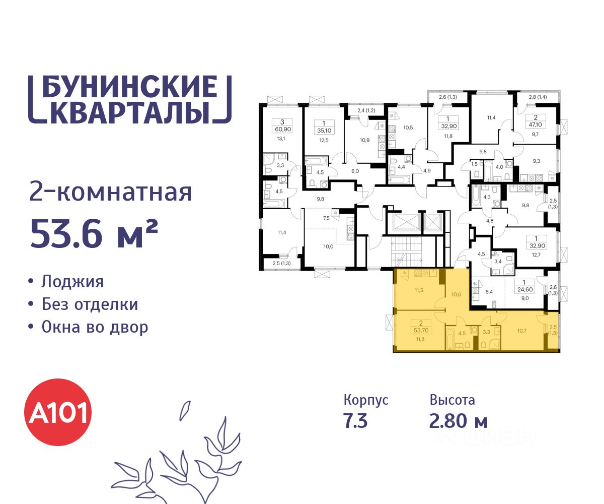 Продается двухкомнатная квартира 772 в новостройке ЖК "Бунинские кварталы" по адресу Москва, ТиНАО, Новомосковский АО, Сосенское С/П, жилой комплекс Бунинские Кварталы, 7.3, район Коммунарка, Новомосковский административный округ, Москва. Общая площадь квартиры - 53.60 кв. м., этаж 17 из 17, секция 10. Тип проекта, по которому построен дом - монолит, компания-застройщик - ООО "А101". Стоимость квартиры - 18626000 Р.