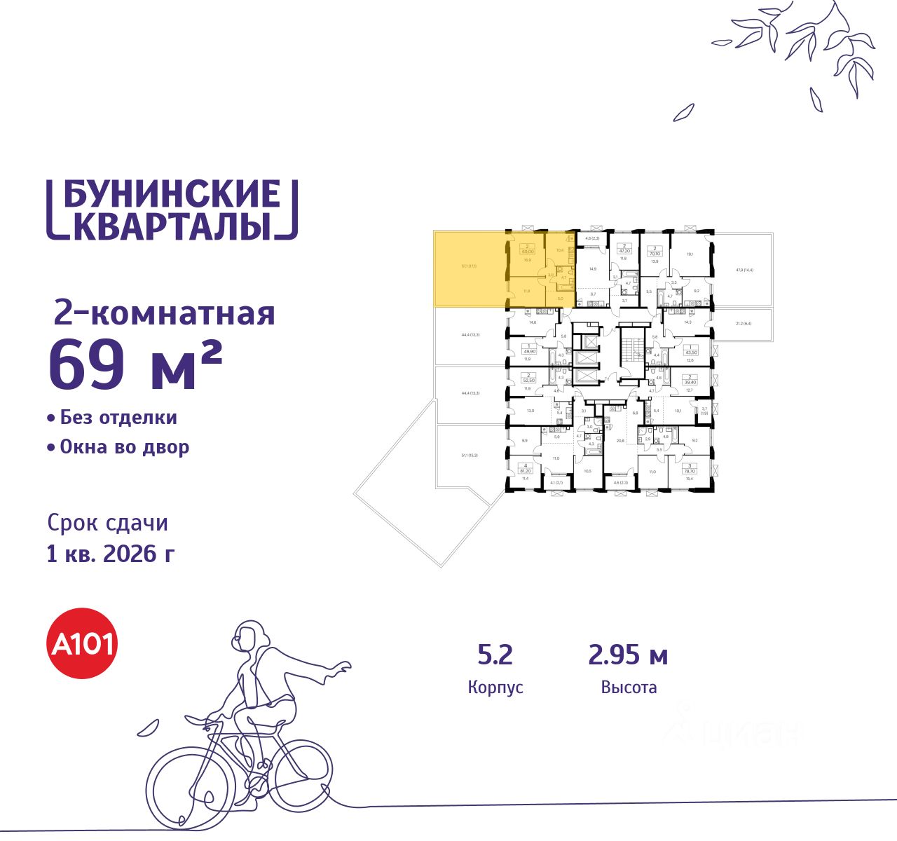 Продается двухкомнатная квартира 475 в новостройке ЖК "Бунинские кварталы" по адресу Москва, ТиНАО, Новомосковский АО, Сосенское С/П, Москва, Новомосковский административный округ, район Коммунарка, проспект Куприна, 9к1. Общая площадь квартиры - 69.00 кв. м., этаж 2 из 22, секция 8. Тип проекта, по которому построен дом - монолит, компания-застройщик - ООО "А101". Стоимость квартиры - 20999460 Р. Срок сдачи - 2 квартал 2026.