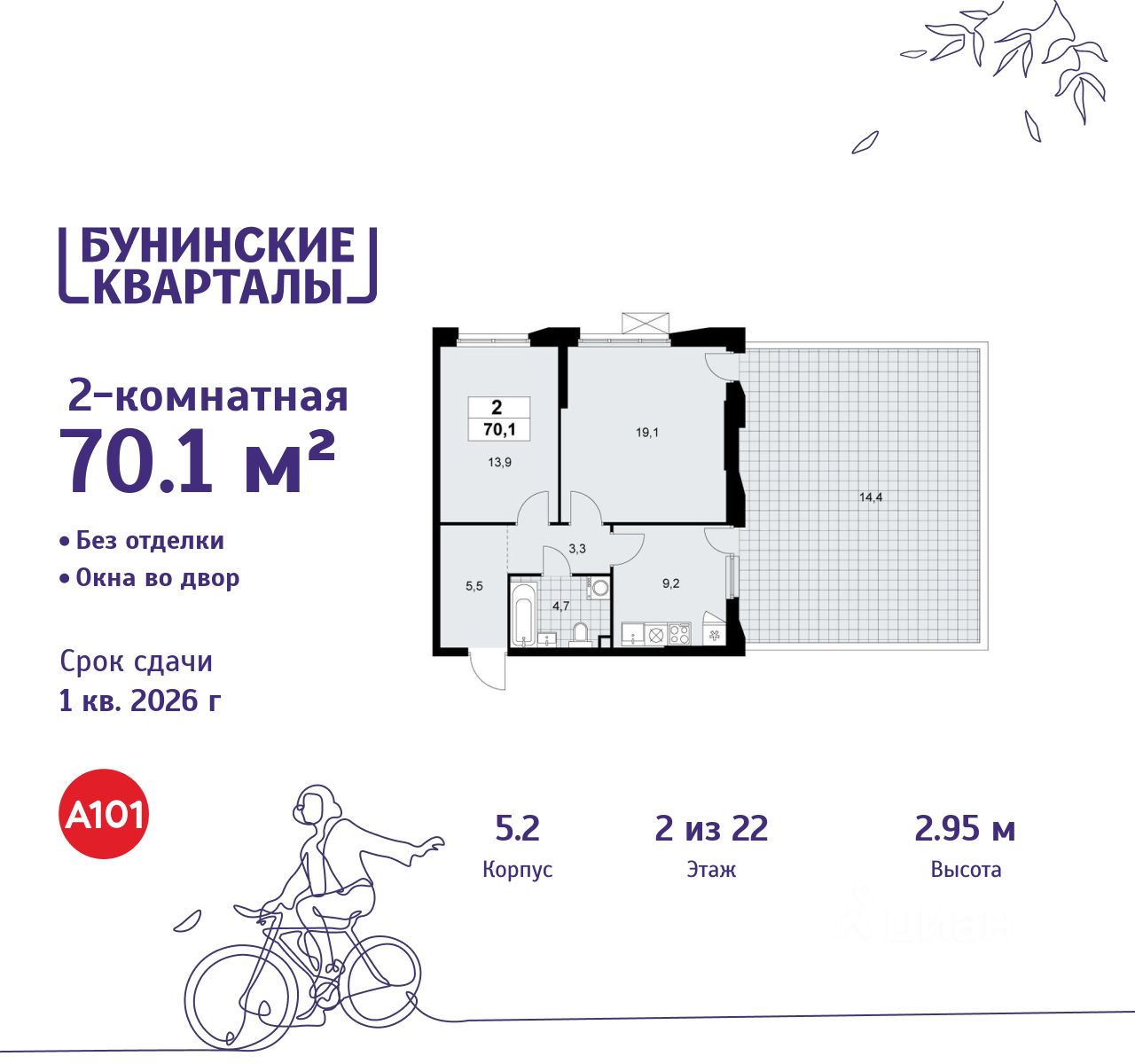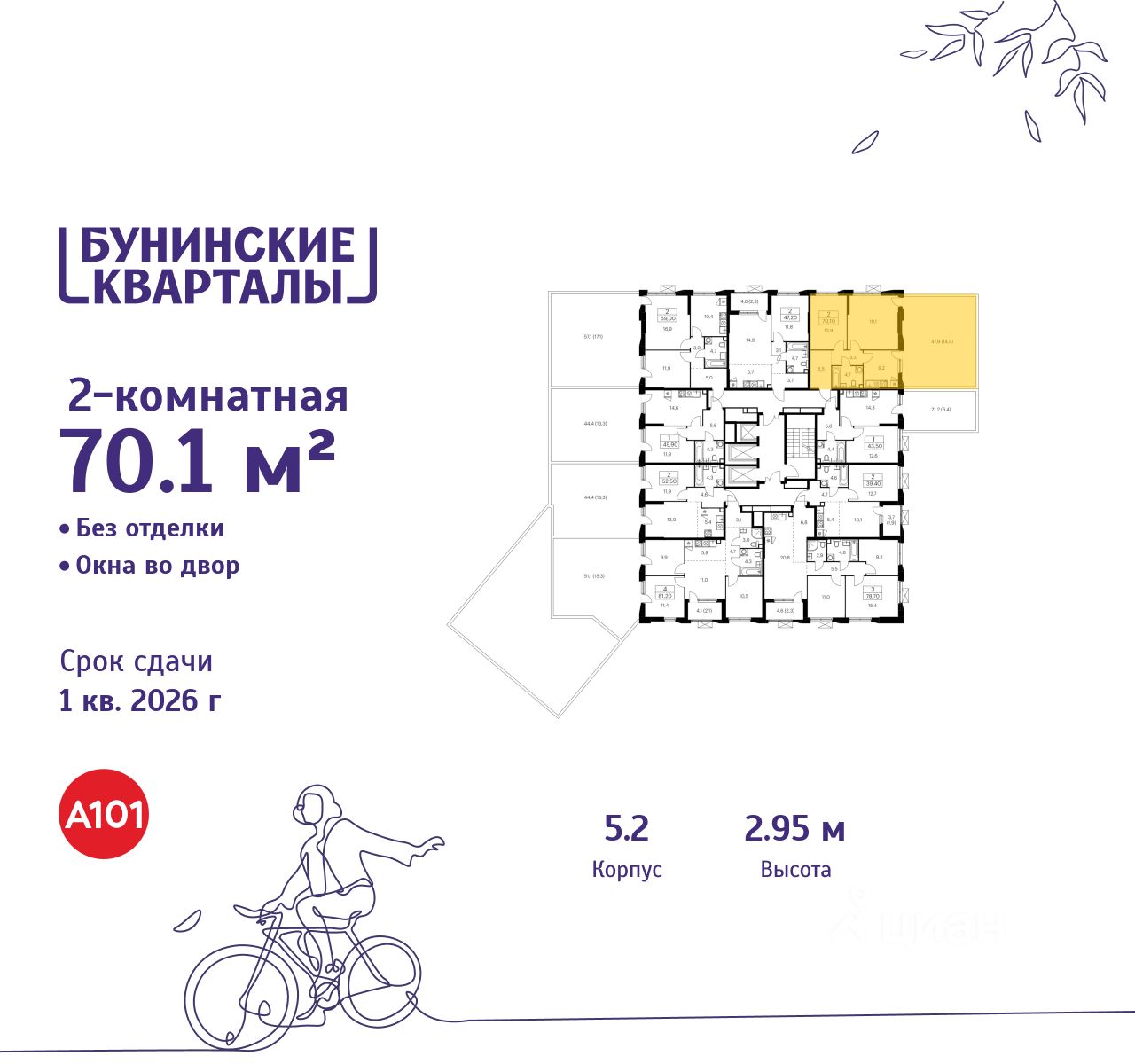 Продается двухкомнатная квартира 477 в новостройке ЖК "Бунинские кварталы" по адресу Москва, ТиНАО, Новомосковский АО, Сосенское С/П, Москва, Новомосковский административный округ, район Коммунарка, проспект Куприна, 9к1. Общая площадь квартиры - 70.10 кв. м., этаж 2 из 22, секция 8. Тип проекта, по которому построен дом - монолит, компания-застройщик - ООО "А101". Стоимость квартиры - 20926953 Р. Срок сдачи - 2 квартал 2026.