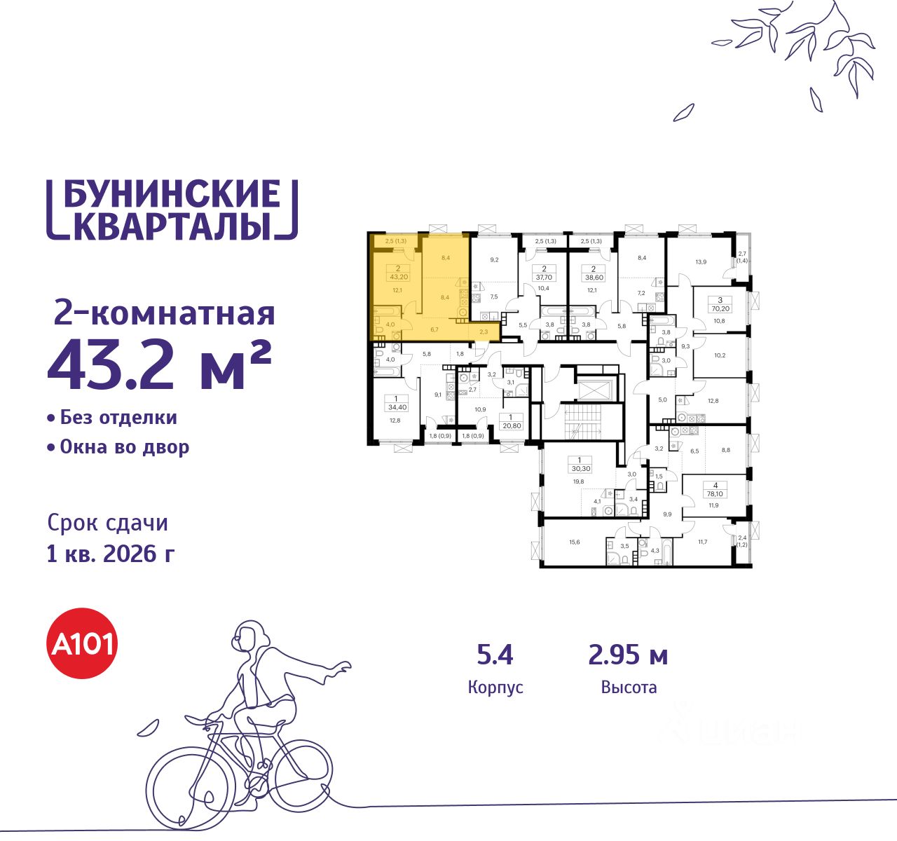 Продается двухкомнатная квартира 978 в новостройке ЖК "Бунинские кварталы" по адресу Москва, ТиНАО, Новомосковский АО, Сосенское С/П, жилой комплекс Бунинские Кварталы, корп. 5.4. Общая площадь квартиры - 43.20 кв. м., этаж 8 из 9, секция 11. Тип проекта, по которому построен дом - монолит, компания-застройщик - ООО "А101". Стоимость квартиры - 15641856 Р. Срок сдачи - 2 квартал 2026.