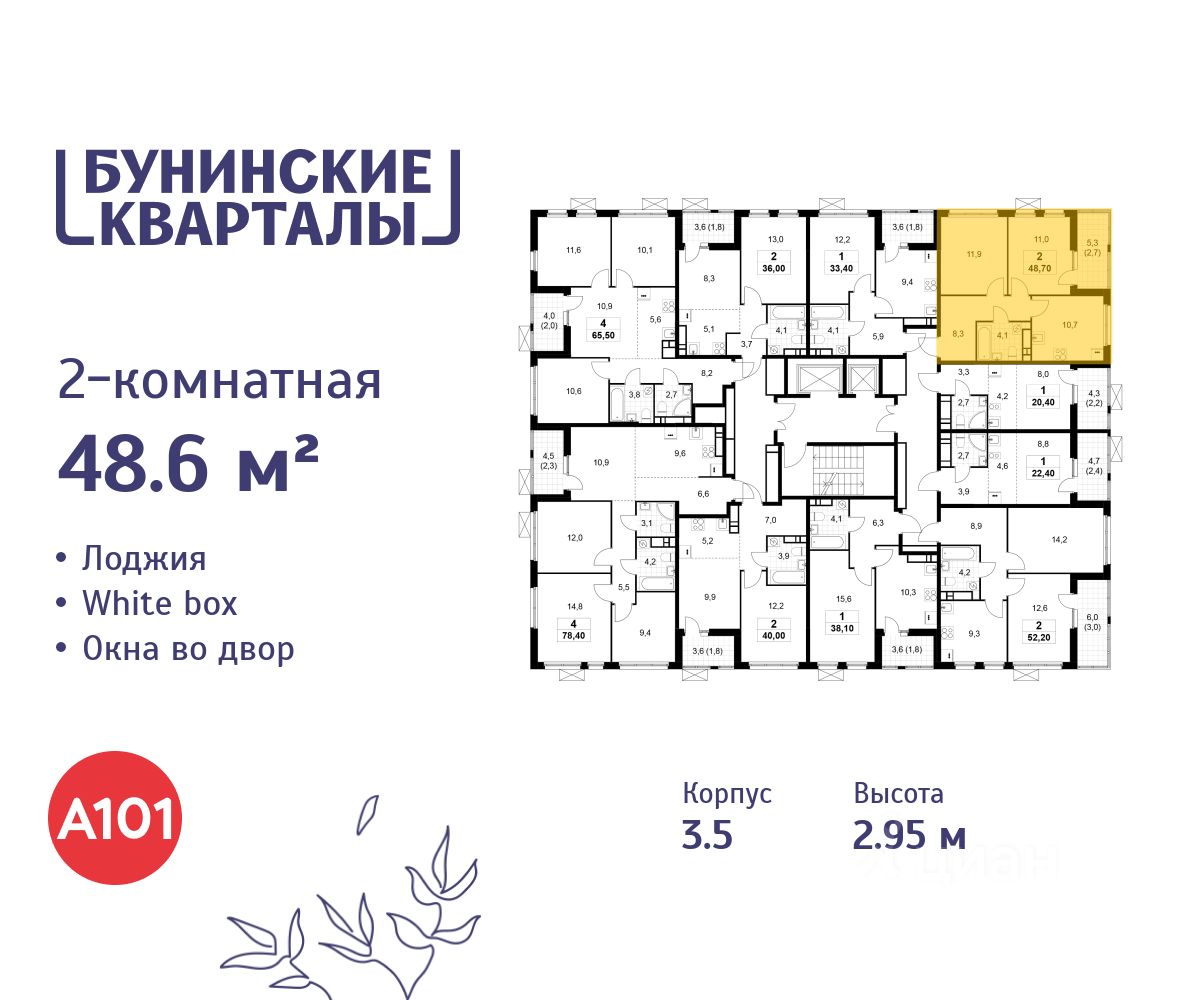 Продается двухкомнатная квартира 465 в новостройке ЖК "Бунинские кварталы" по адресу Москва, ТиНАО, Новомосковский АО, Сосенское С/П, жилой комплекс Бунинские Кварталы, к3.5, район Коммунарка, Новомосковский административный округ, Москва. Общая площадь квартиры - 48.60 кв. м., этаж 13 из 17, секция 7. Тип проекта, по которому построен дом - монолит, компания-застройщик - ООО "А101". Стоимость квартиры - 20215170 Р.