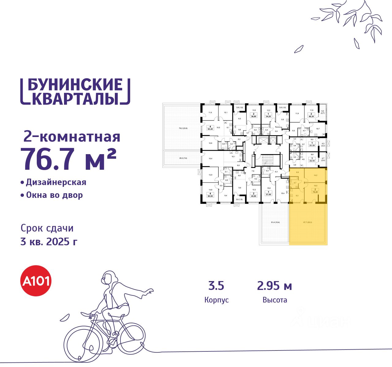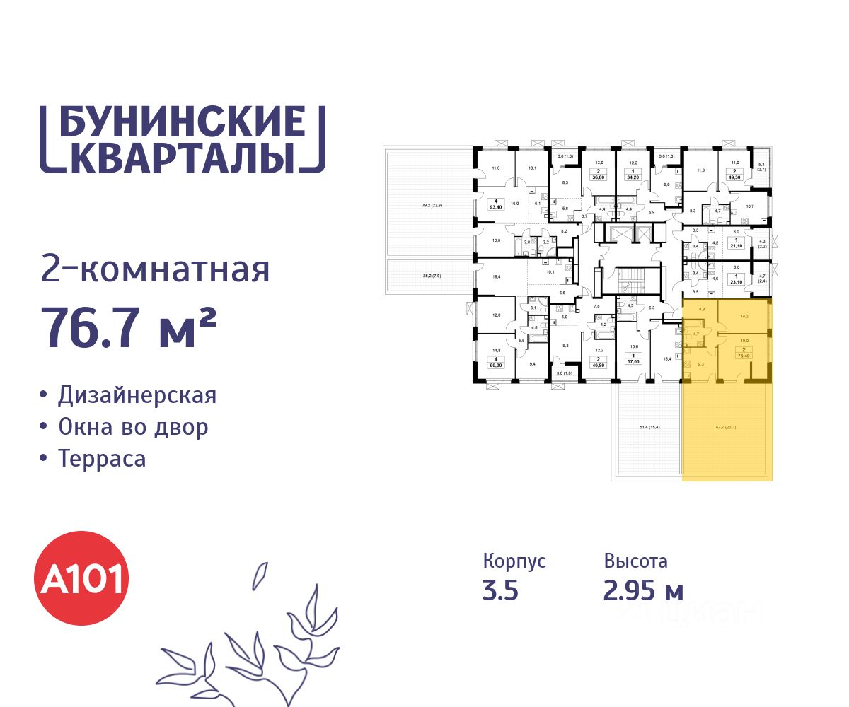 Продается двухкомнатная квартира 358 в новостройке ЖК "Бунинские кварталы" по адресу Москва, ТиНАО, Новомосковский АО, Сосенское С/П, жилой комплекс Бунинские Кварталы, к3.5, район Коммунарка, Новомосковский административный округ, Москва. Общая площадь квартиры - 76.70 кв. м., этаж 2 из 17, секция 7. Тип проекта, по которому построен дом - монолит, компания-застройщик - ООО "А101". Стоимость квартиры - 21788450 Р.
