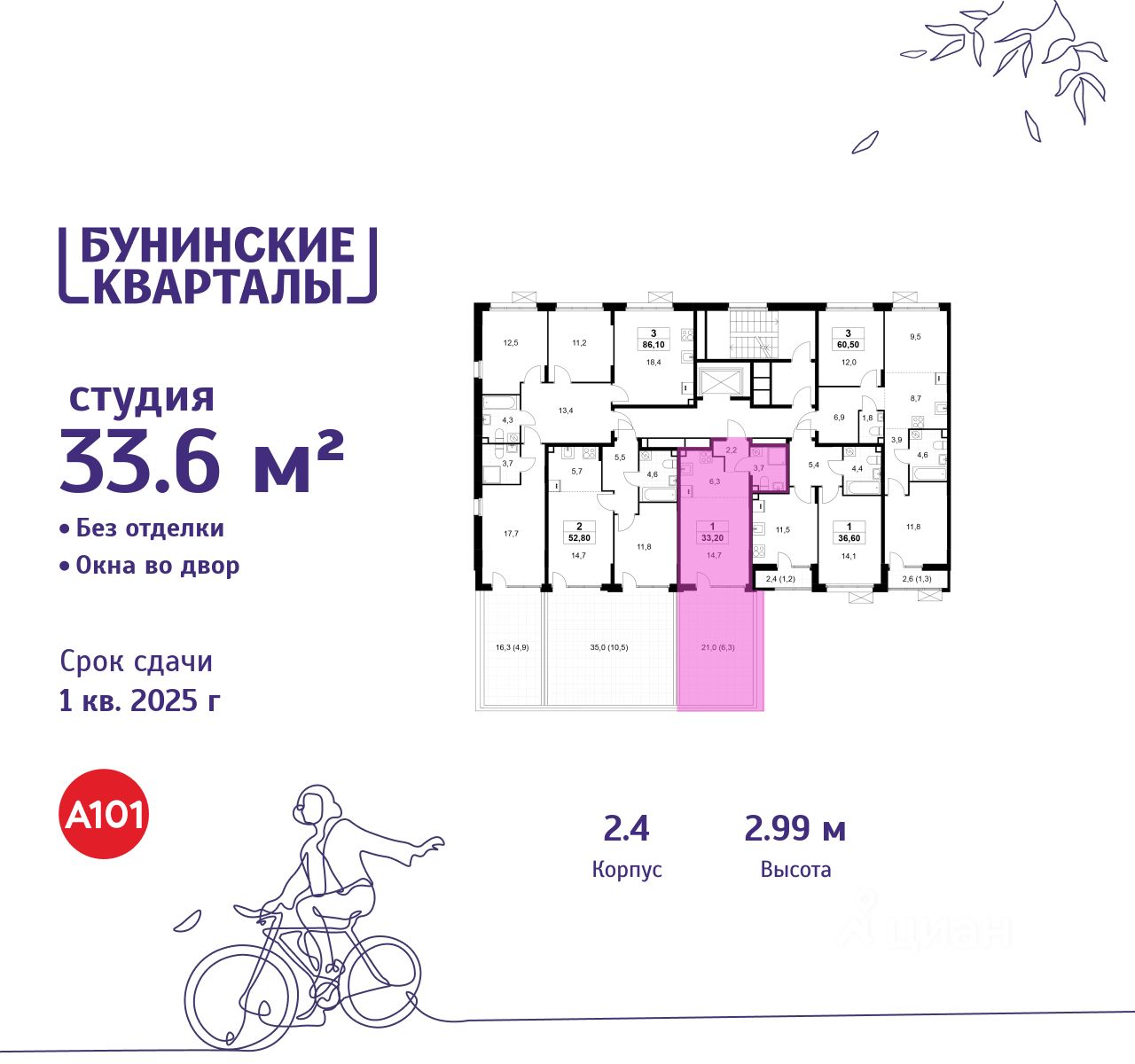 Продается студия 301 в новостройке ЖК "Бунинские кварталы" по адресу Москва, ТиНАО, Новомосковский АО, Сосенское С/П, жилой комплекс Бунинские Кварталы, корп. 2.4. Общая площадь квартиры - 33.60 кв. м., этаж 2 из 8, секция 5. Тип проекта, по которому построен дом - монолит, компания-застройщик - ООО "А101". Стоимость квартиры - 11451552 Р.