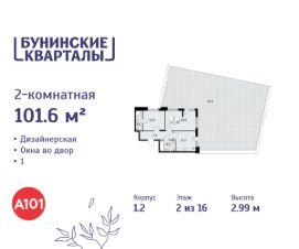 Продается двухкомнатная квартира 163 в новостройке ЖК "Бунинские кварталы" по адресу Москва, ТиНАО, Новомосковский АО, Сосенское С/П, жилой комплекс Бунинские Кварталы, к1.2, район Коммунарка, Новомосковский административный округ, Москва. Общая площадь квартиры - 101.60 кв. м., этаж 2 из 16, секция 2. Тип проекта, по которому построен дом - монолит, компания-застройщик - ООО "А101". Стоимость квартиры - 24342760 Р.
