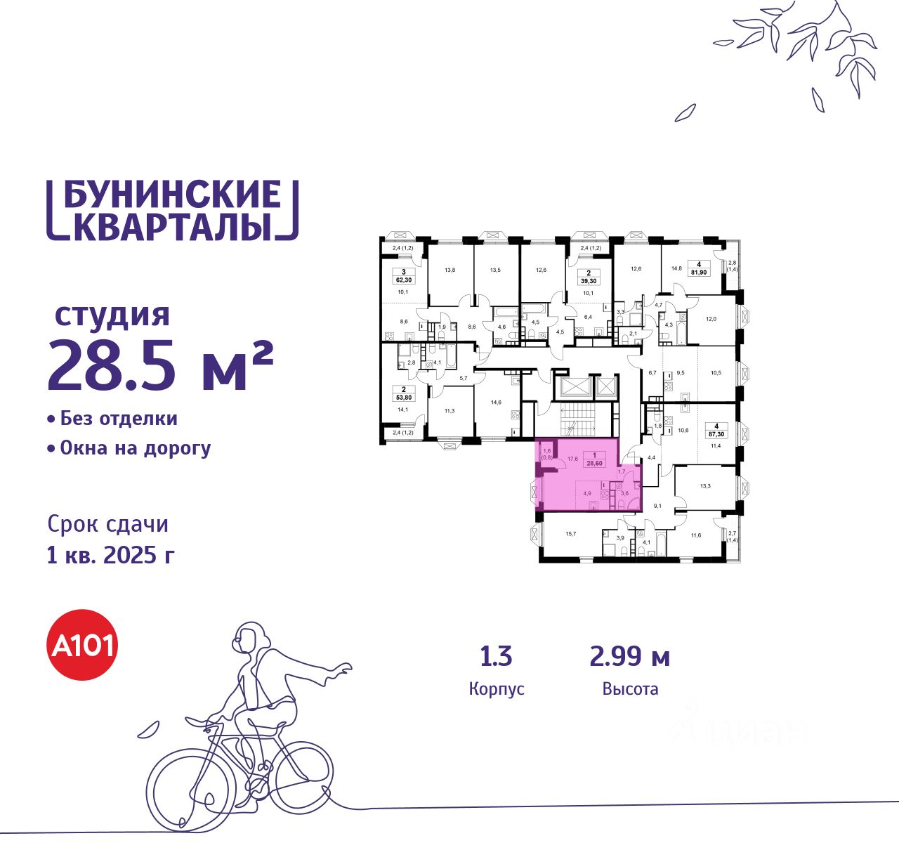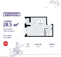 Продается студия 799 в новостройке ЖК "Бунинские кварталы" по адресу Москва, ТиНАО, Новомосковский АО, Сосенское С/П, жилой комплекс Бунинские Кварталы, к1.3, район Коммунарка, Новомосковский административный округ, Москва. Общая площадь квартиры - 28.50 кв. м., этаж 8 из 16, секция 12. Тип проекта, по которому построен дом - монолит, компания-застройщик - ООО "А101". Стоимость квартиры - 12439680 Р.