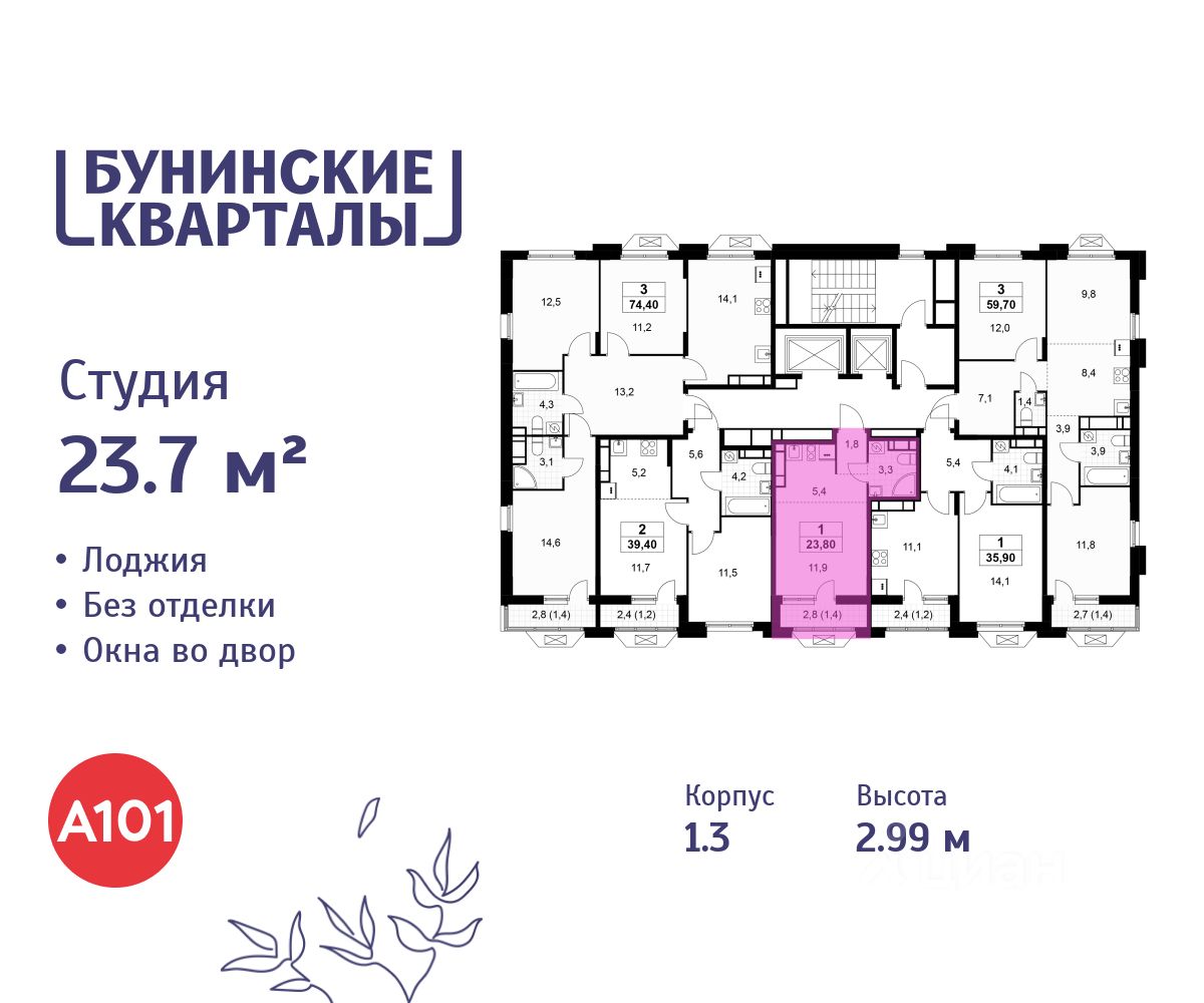 Продается студия 504 в новостройке ЖК "Бунинские кварталы" по адресу Москва, ТиНАО, Новомосковский АО, Сосенское С/П, жилой комплекс Бунинские Кварталы, к1.3, район Коммунарка, Новомосковский административный округ, Москва. Общая площадь квартиры - 23.70 кв. м., этаж 15 из 15, секция 6. Тип проекта, по которому построен дом - монолит, компания-застройщик - ООО "А101". Стоимость квартиры - 11405625 Р.
