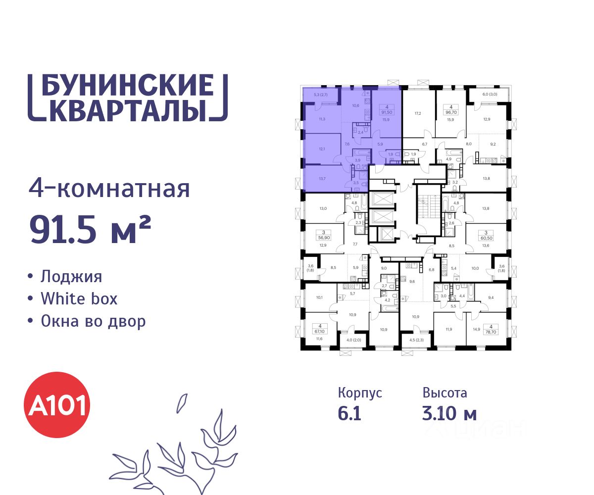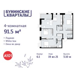 Продается четырехкомнатная квартира 167 в новостройке ЖК "Бунинские кварталы" по адресу Москва, ТиНАО, Новомосковский АО, Сосенское С/П, жилой комплекс Бунинские Кварталы, 6.1, район Коммунарка, Новомосковский административный округ, Москва. Общая площадь квартиры - 91.50 кв. м., этаж 19 из 21, секция 1. Тип проекта, по которому построен дом - монолит, компания-застройщик - ООО "А101". Стоимость квартиры - 33000390 Р.