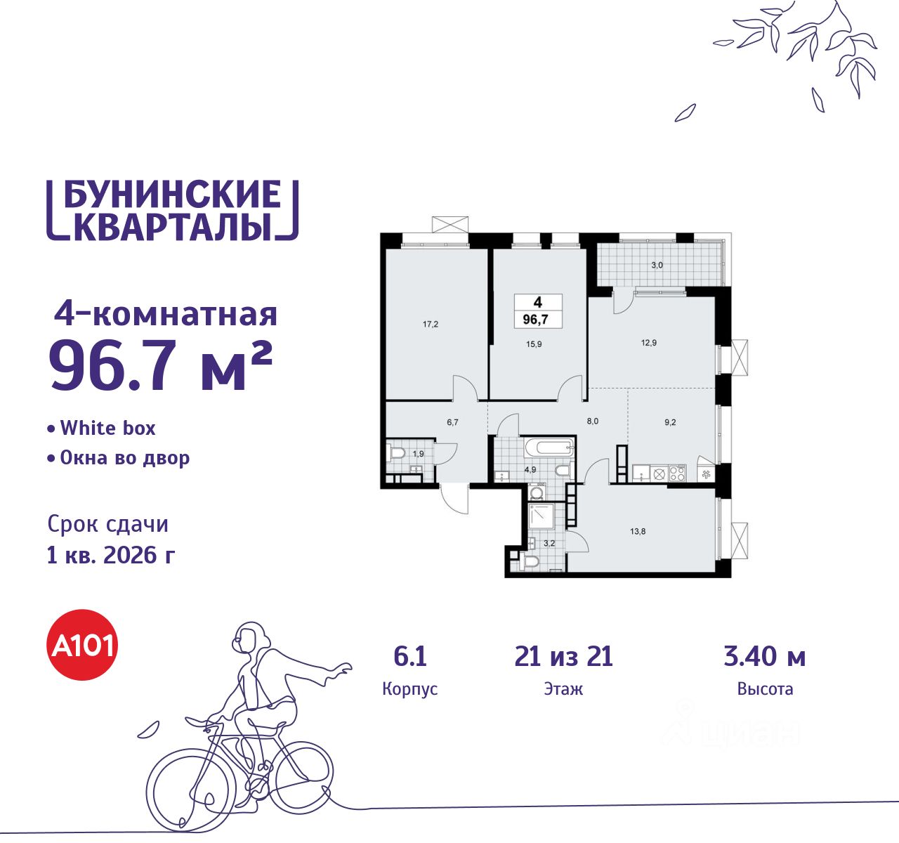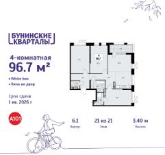 Продается четырехкомнатная квартира 180 в новостройке ЖК "Бунинские кварталы" по адресу Москва, ТиНАО, Новомосковский АО, Сосенское С/П, жилой комплекс Бунинские Кварталы, 6.1, район Коммунарка, Новомосковский административный округ, Москва. Общая площадь квартиры - 96.70 кв. м., этаж 21 из 21, секция 1. Тип проекта, по которому построен дом - монолит, компания-застройщик - ООО "А101". Стоимость квартиры - 40438006 Р. Срок сдачи - 1 квартал 2026.