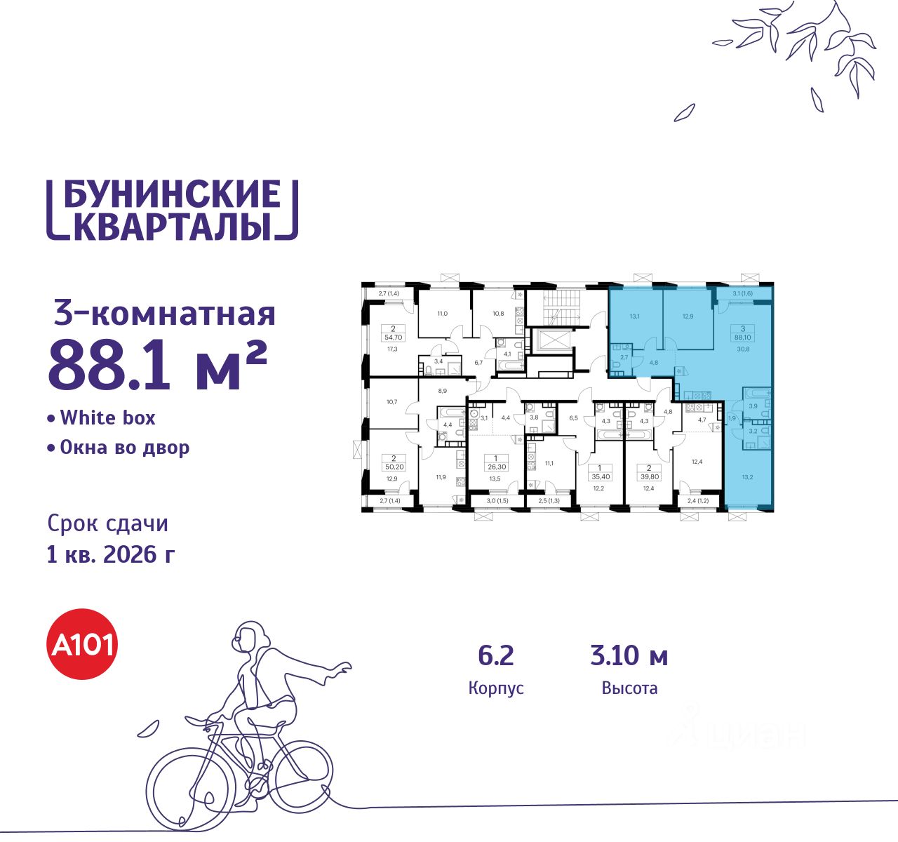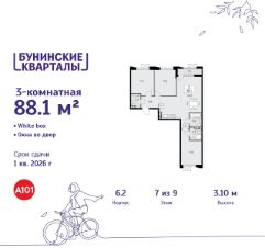Продается трехкомнатная квартира 211 в новостройке ЖК "Бунинские кварталы" по адресу Москва, ТиНАО, Новомосковский АО, Сосенское С/П, жилой комплекс Бунинские Кварталы, корп. 6.2. Общая площадь квартиры - 88.10 кв. м., этаж 7 из 9, секция 2. Тип проекта, по которому построен дом - монолит, компания-застройщик - ООО "А101". Стоимость квартиры - 30002455 Р. Срок сдачи - 1 квартал 2026.