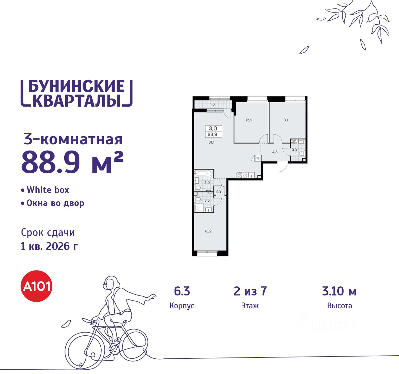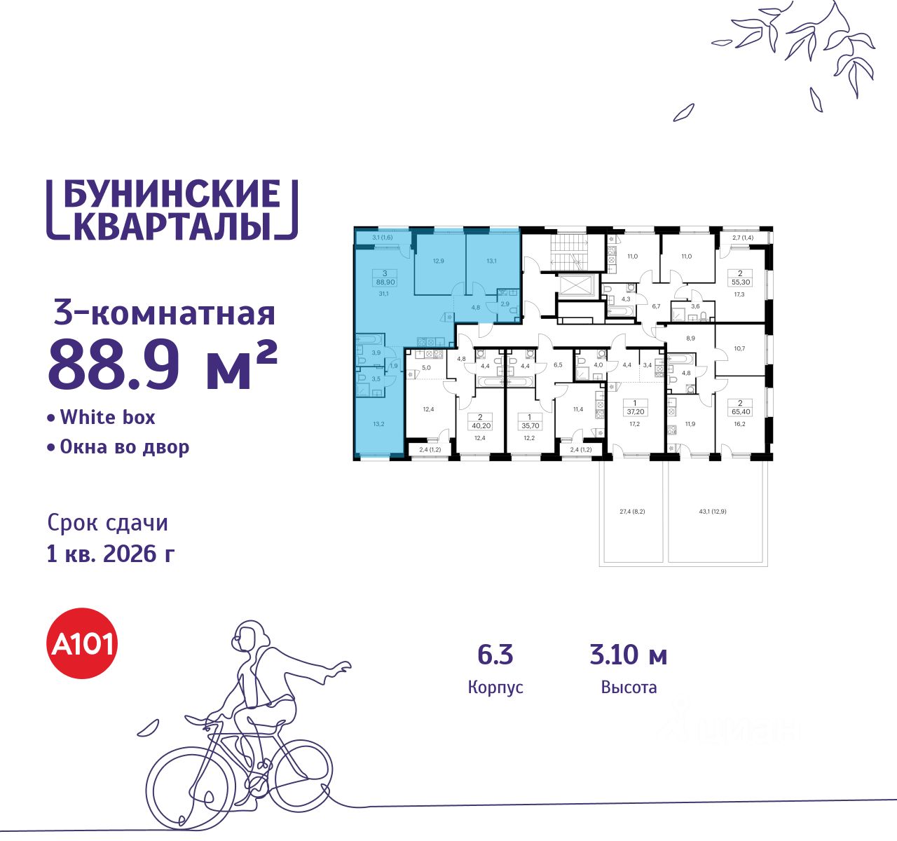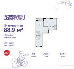Продается трехкомнатная квартира 304 в новостройке ЖК "Бунинские кварталы" по адресу Москва, ТиНАО, Новомосковский АО, Сосенское С/П, жилой комплекс Бунинские Кварталы, корп. 6.3. Общая площадь квартиры - 88.90 кв. м., этаж 2 из 7, секция 5. Тип проекта, по которому построен дом - монолит, компания-застройщик - ООО "А101". Стоимость квартиры - 28341320 Р. Срок сдачи - 1 квартал 2026.