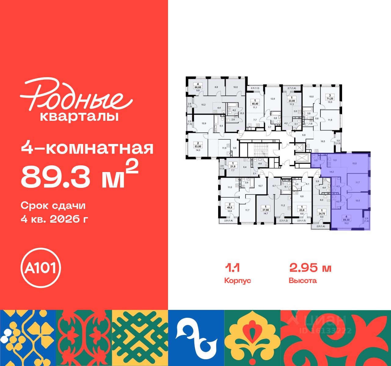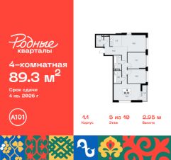 Продается четырехкомнатная квартира 34 в новостройке Жилой район "Родные кварталы" по адресу Москва, ТиНАО, Новомосковский АО, Марушкинское С/П, жилой комплекс Родные Кварталы, 1.1, район Внуково, Новомосковский административный округ, Москва. Общая площадь квартиры - 89.30 кв. м., этаж 5 из 10, секция 1. Тип проекта, по которому построен дом - монолит, компания-застройщик - ООО "А101". Стоимость квартиры - 24388723 Р. Срок сдачи - 4 квартал 2026.