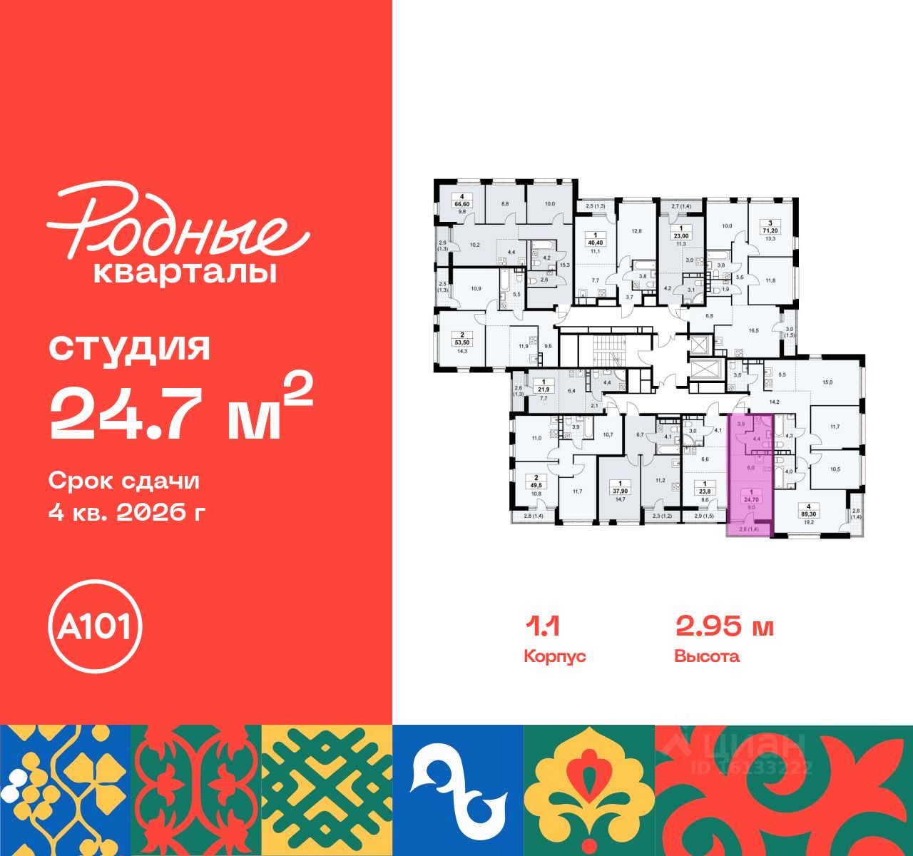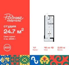 Продается студия 90 в новостройке Жилой район "Родные кварталы" по адресу Москва, ТиНАО, Новомосковский АО, Марушкинское С/П, жилой комплекс Родные Кварталы, 1.1, район Внуково, Новомосковский административный округ, Москва. Общая площадь квартиры - 24.70 кв. м., этаж 10 из 10, секция 1. Тип проекта, по которому построен дом - монолит, компания-застройщик - ООО "А101". Стоимость квартиры - 10064262 Р. Срок сдачи - 4 квартал 2026.