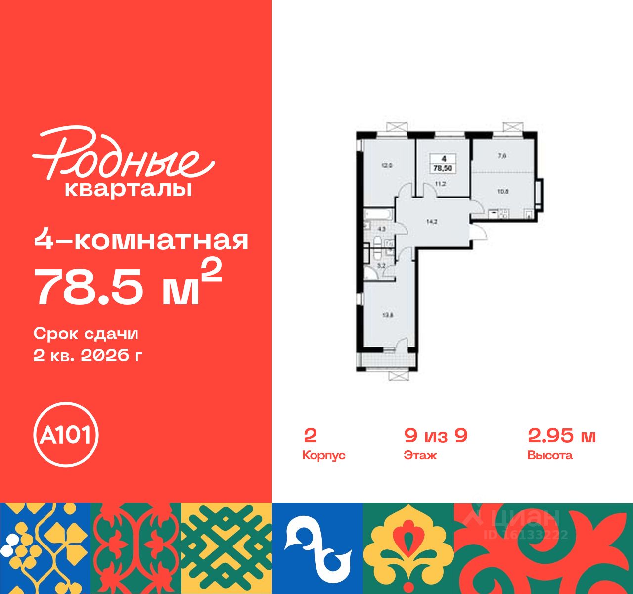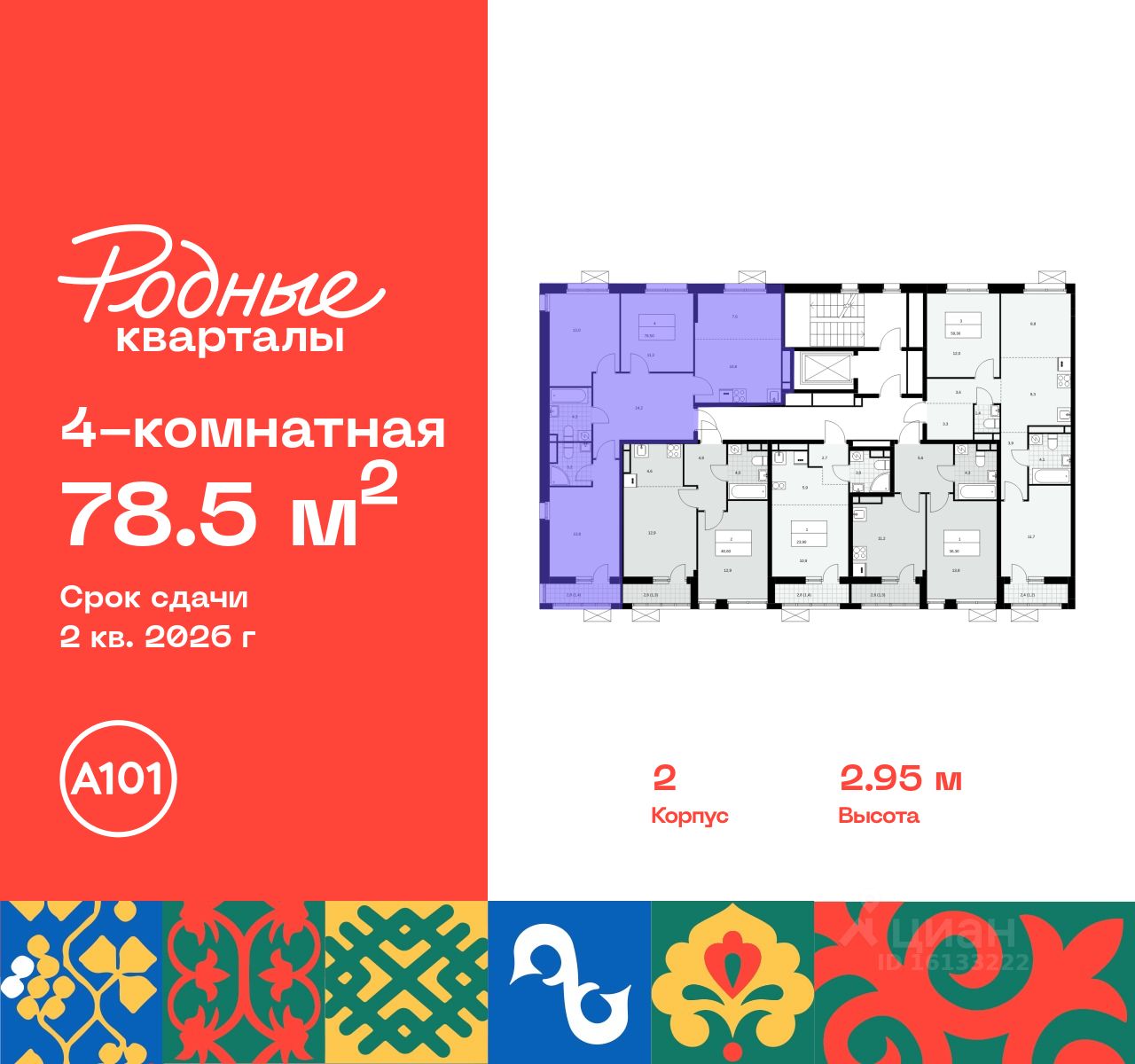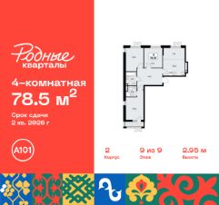 Продается четырехкомнатная квартира 40 в новостройке Жилой район "Родные кварталы" по адресу Москва, ТиНАО, Новомосковский АО, Марушкинское С/П, жилой комплекс Родные Кварталы, 2, район Внуково, Новомосковский административный округ, Москва. Общая площадь квартиры - 78.50 кв. м., этаж 9 из 9, секция 1. Тип проекта, по которому построен дом - монолит, компания-застройщик - ООО "А101". Стоимость квартиры - 20888065 Р. Срок сдачи - 2 квартал 2026.