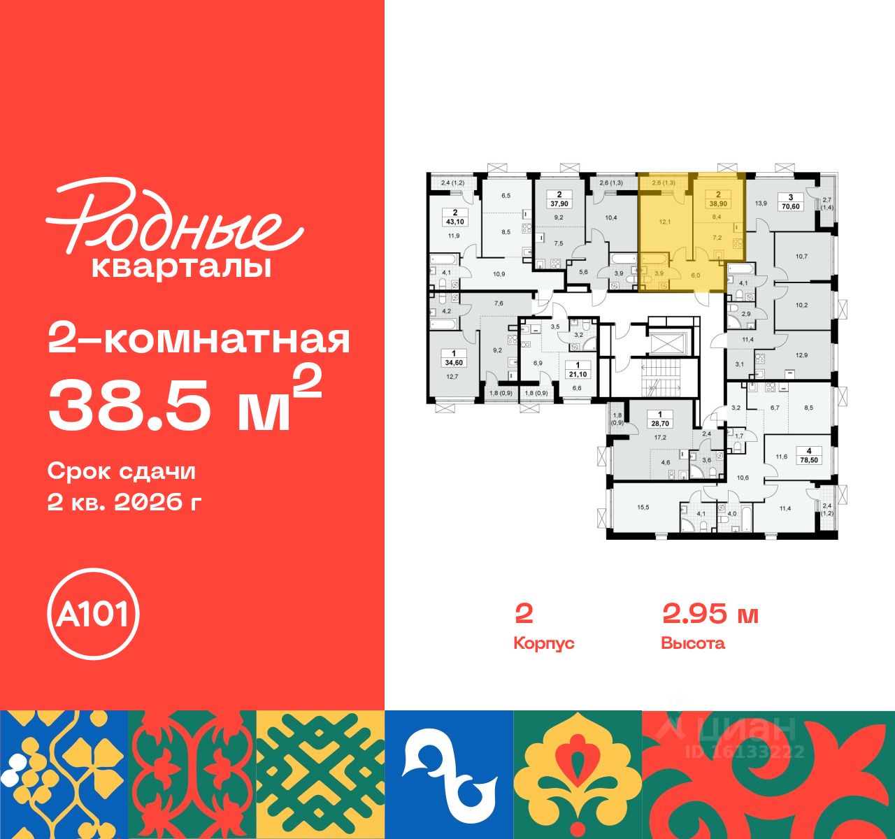 Продается двухкомнатная квартира 429 в новостройке Жилой район "Родные кварталы" по адресу Москва, ТиНАО, Новомосковский АО, Марушкинское С/П, жилой комплекс Родные Кварталы, 2, район Внуково, Новомосковский административный округ, Москва. Общая площадь квартиры - 38.50 кв. м., этаж 8 из 9, секция 9. Тип проекта, по которому построен дом - монолит, компания-застройщик - ООО "А101". Стоимость квартиры - 10968650 Р. Срок сдачи - 2 квартал 2026.