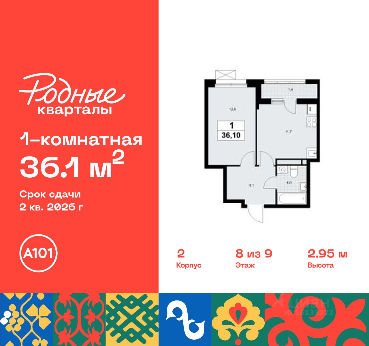 Продается однокомнатная квартира 273 в новостройке Жилой район "Родные кварталы" по адресу Москва, ТиНАО, Новомосковский АО, Марушкинское С/П, жилой комплекс Родные Кварталы, 2, район Внуково, Новомосковский административный округ, Москва. Общая площадь квартиры - 36.10 кв. м., этаж 8 из 9, секция 6. Тип проекта, по которому построен дом - монолит, компания-застройщик - ООО "А101". Стоимость квартиры - 11031799 Р. Срок сдачи - 2 квартал 2026.