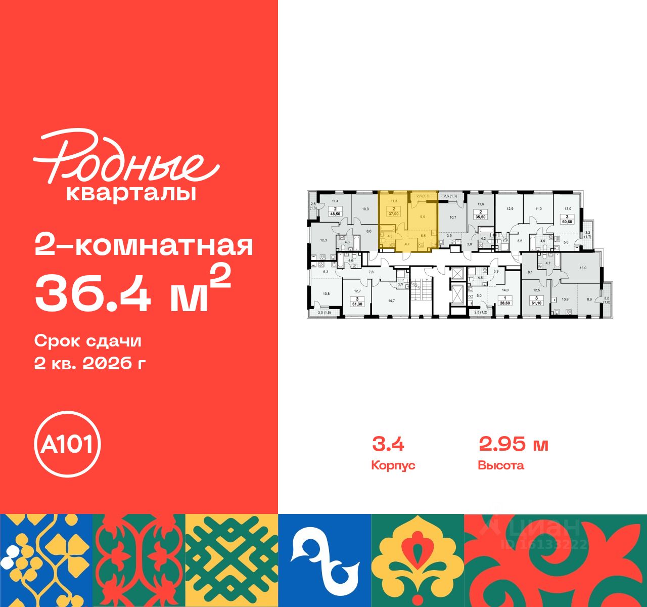 Продается двухкомнатная квартира 530 в новостройке Жилой район "Родные кварталы" по адресу Москва, ТиНАО, Новомосковский АО, Марушкинское С/П, жилой комплекс Родные Кварталы, 3.4, район Внуково, Новомосковский административный округ, Москва. Общая площадь квартиры - 36.40 кв. м., этаж 10 из 10, секция 11. Тип проекта, по которому построен дом - монолит, компания-застройщик - ООО "А101". Стоимость квартиры - 11994892 Р. Срок сдачи - 2 квартал 2026.