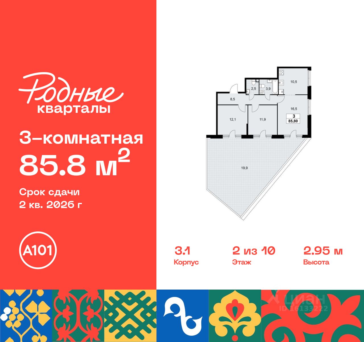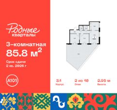Продается трехкомнатная квартира 141 в новостройке Жилой район "Родные кварталы" по адресу Москва, ТиНАО, Новомосковский АО, Марушкинское С/П, жилой комплекс Родные Кварталы, 3.1, район Внуково, Новомосковский административный округ, Москва. Общая площадь квартиры - 85.80 кв. м., этаж 2 из 10, секция 4. Тип проекта, по которому построен дом - монолит, компания-застройщик - ООО "А101". Стоимость квартиры - 22130394 Р. Срок сдачи - 2 квартал 2026.