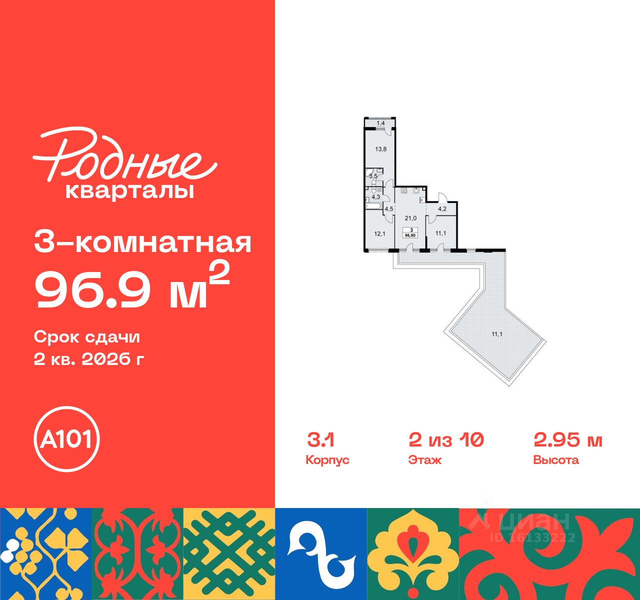 Продается трехкомнатная квартира 136 в новостройке Жилой район "Родные кварталы" по адресу Москва, ТиНАО, Новомосковский АО, Марушкинское С/П, жилой комплекс Родные Кварталы, 3.1, район Внуково, Новомосковский административный округ, Москва. Общая площадь квартиры - 96.90 кв. м., этаж 2 из 10, секция 4. Тип проекта, по которому построен дом - монолит, компания-застройщик - ООО "А101". Стоимость квартиры - 23440110 Р. Срок сдачи - 2 квартал 2026.