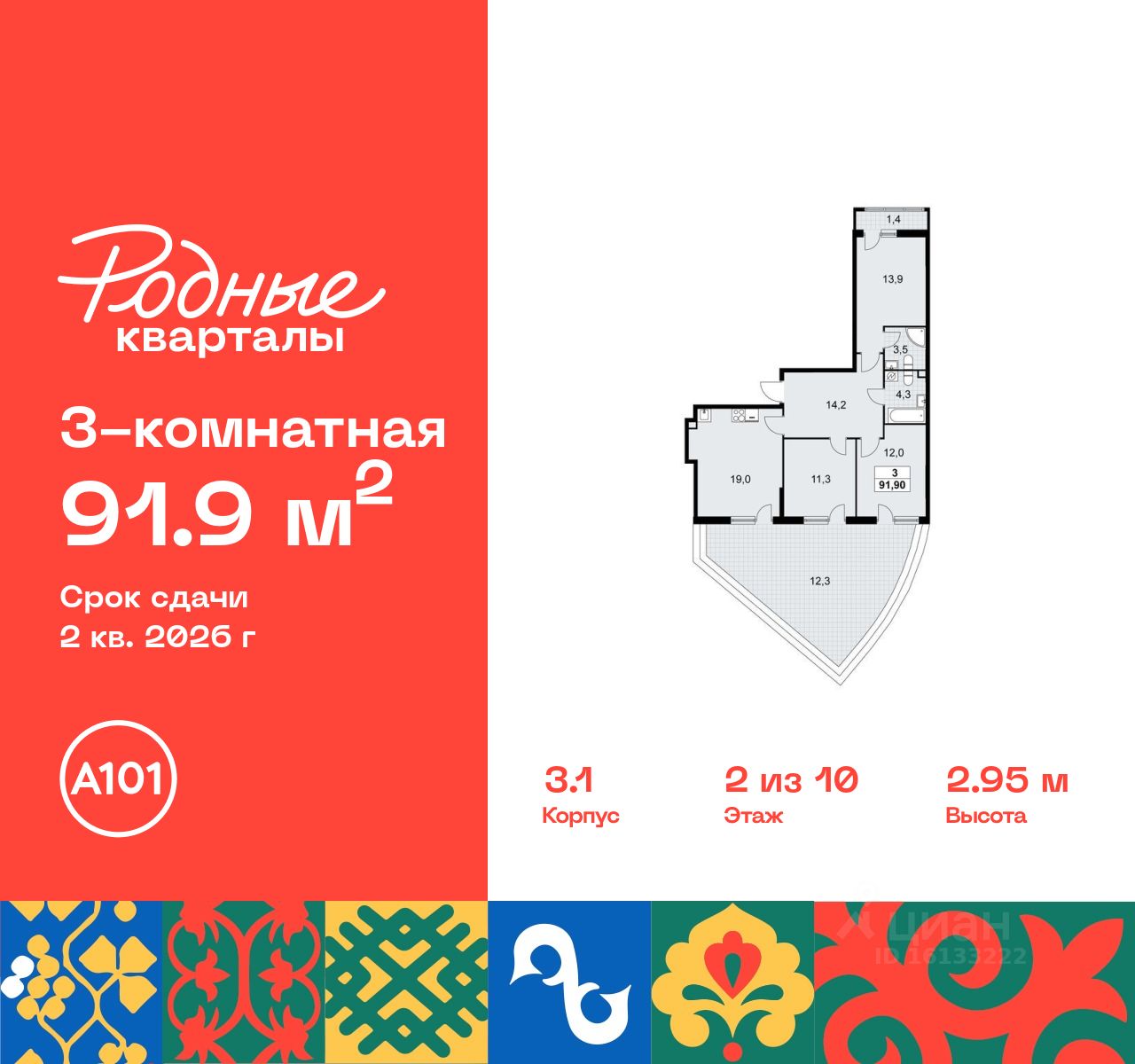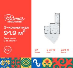 Продается трехкомнатная квартира 50 в новостройке Жилой район "Родные кварталы" по адресу Москва, ТиНАО, Новомосковский АО, Марушкинское С/П, жилой комплекс Родные Кварталы, 3.1, район Внуково, Новомосковский административный округ, Москва. Общая площадь квартиры - 91.90 кв. м., этаж 2 из 10, секция 2. Тип проекта, по которому построен дом - монолит, компания-застройщик - ООО "А101". Стоимость квартиры - 23716633 Р. Срок сдачи - 2 квартал 2026.
