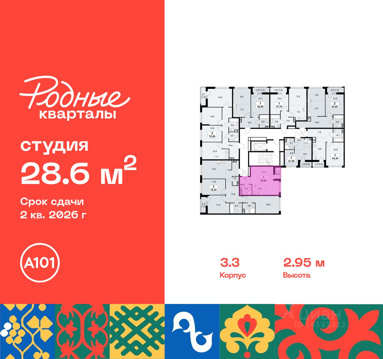 Продается студия 424 в новостройке Жилой район "Родные кварталы" по адресу Москва, ТиНАО, Новомосковский АО, Марушкинское С/П, жилой комплекс Родные Кварталы, 3.3, район Внуково, Новомосковский административный округ, Москва. Общая площадь квартиры - 28.60 кв. м., этаж 9 из 9, секция 9. Тип проекта, по которому построен дом - монолит, компания-застройщик - ООО "А101". Стоимость квартиры - 11228074 Р. Срок сдачи - 2 квартал 2026.