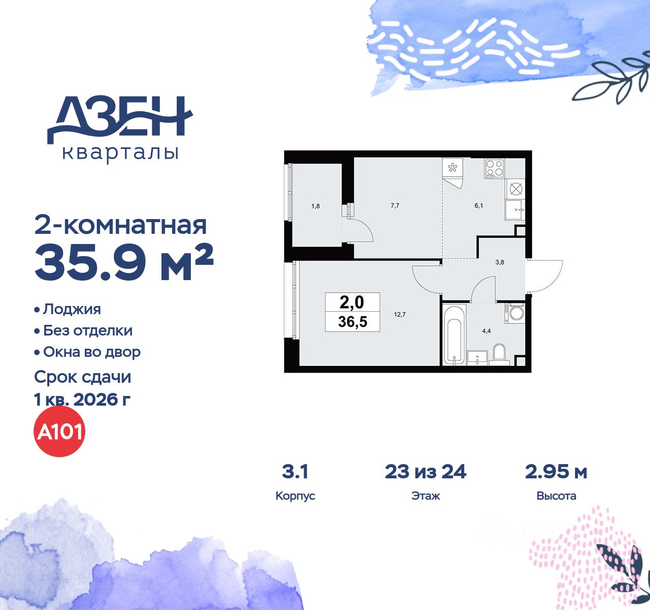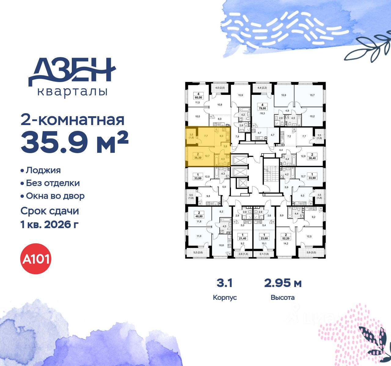 Продается двухкомнатная квартира 211 в новостройке ЖК "Дзен-кварталы" по адресу Москва, ТиНАО, Новомосковский АО, Сосенское С/П, Россия, Москва, ТиНАО, Новомосковский АО, Сосенское С/П, жилой комплекс Дзен-кварталы, 3.1. Общая площадь квартиры - 35.90 кв. м., этаж 23 из 24, секция 1. Тип проекта, по которому построен дом - монолит, компания-застройщик - ООО "А101". Стоимость квартиры - 18120166 Р.