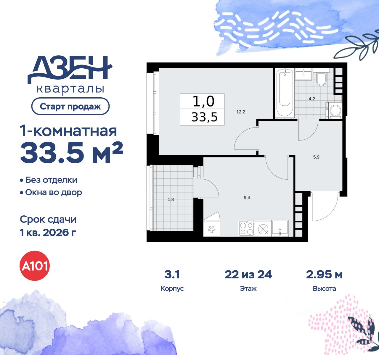Продается однокомнатная квартира 210 в новостройке ЖК "Дзен-кварталы" по адресу Москва, ТиНАО, Новомосковский АО, Сосенское С/П, Россия, Москва, ТиНАО, Новомосковский АО, Сосенское С/П, жилой комплекс Дзен-кварталы, 3.1. Общая площадь квартиры - 33.50 кв. м., этаж 22 из 24, секция 1. Тип проекта, по которому построен дом - монолит, компания-застройщик - ООО "А101". Стоимость квартиры - 16001945 Р.