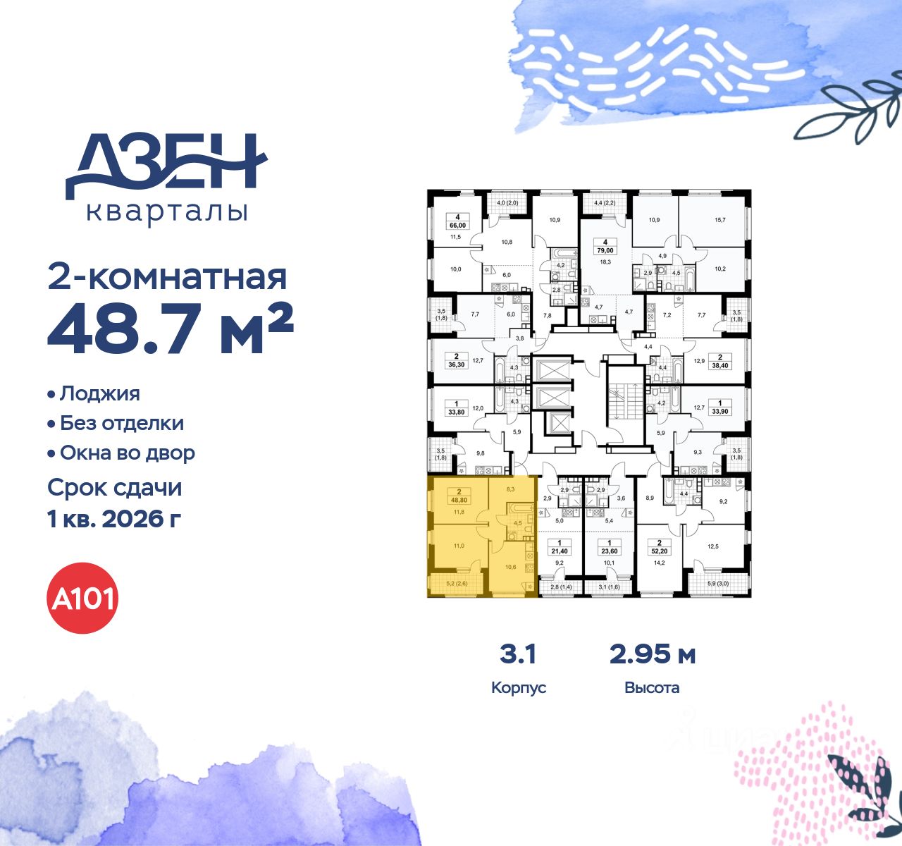 Продается двухкомнатная квартира 189 в новостройке ЖК "Дзен-кварталы" по адресу Москва, ТиНАО, Новомосковский АО, Сосенское С/П, Россия, Москва, ТиНАО, Новомосковский АО, Сосенское С/П, жилой комплекс Дзен-кварталы, 3.1. Общая площадь квартиры - 48.70 кв. м., этаж 20 из 24, секция 1. Тип проекта, по которому построен дом - монолит, компания-застройщик - ООО "А101". Стоимость квартиры - 19740058 Р.