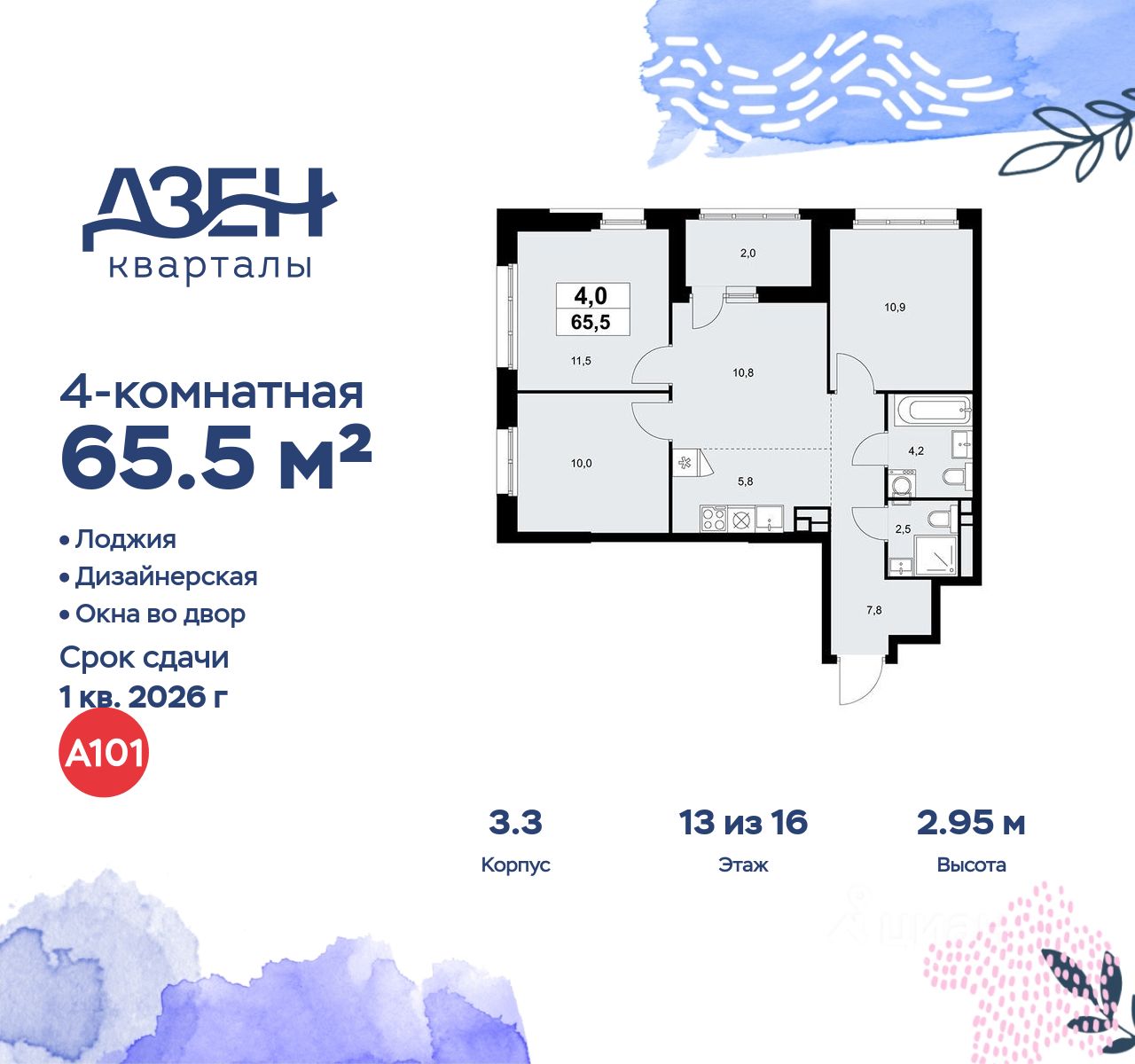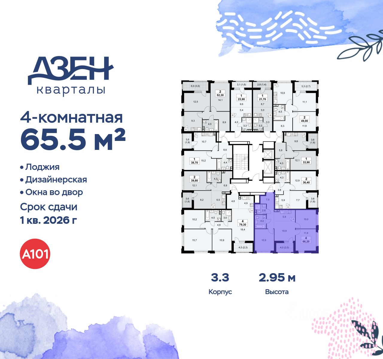 Продается четырехкомнатная квартира 679 в новостройке ЖК "Дзен-кварталы" по адресу Москва, ТиНАО, Новомосковский АО, Сосенское С/П, жилой комплекс Дзен-кварталы, 3.3, район Коммунарка, Новомосковский административный округ, Москва. Общая площадь квартиры - 65.50 кв. м., этаж 13 из 16, секция 8. Тип проекта, по которому построен дом - монолит, компания-застройщик - ООО "А101". Стоимость квартиры - 29530020 Р.