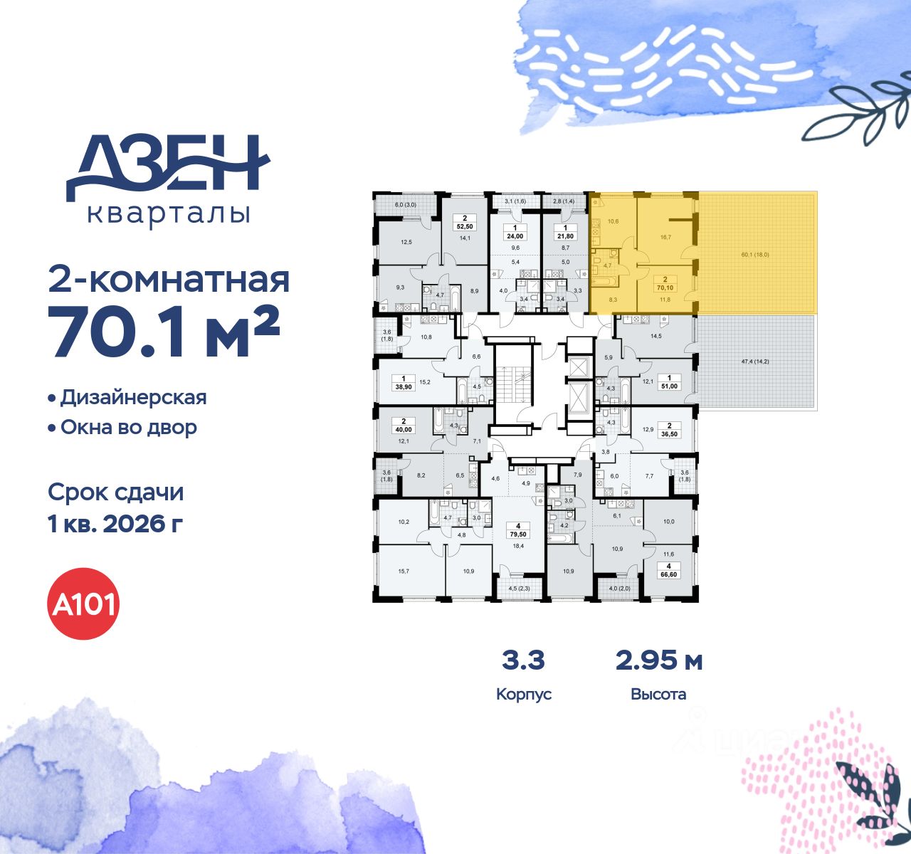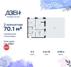 Продается двухкомнатная квартира 576 в новостройке ЖК "Дзен-кварталы" по адресу Москва, ТиНАО, Новомосковский АО, Сосенское С/П, жилой комплекс Дзен-кварталы, 3.3, район Коммунарка, Новомосковский административный округ, Москва. Общая площадь квартиры - 70.10 кв. м., этаж 2 из 16, секция 8. Тип проекта, по которому построен дом - монолит, компания-застройщик - ООО "А101". Стоимость квартиры - 26946955 Р.