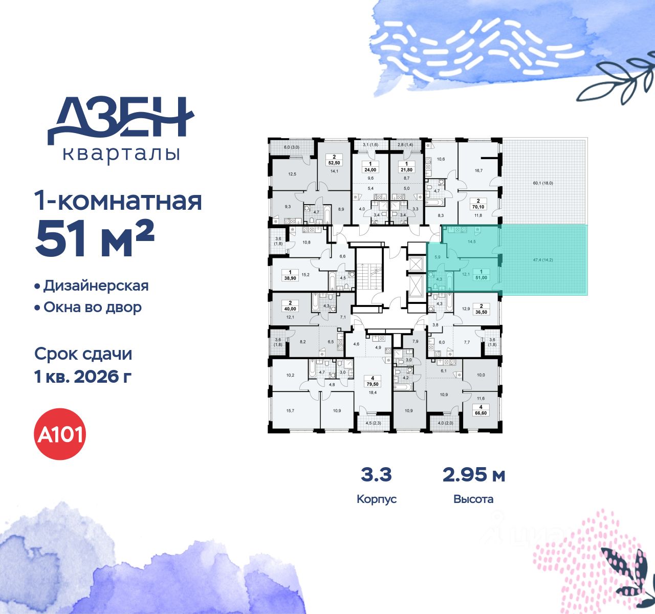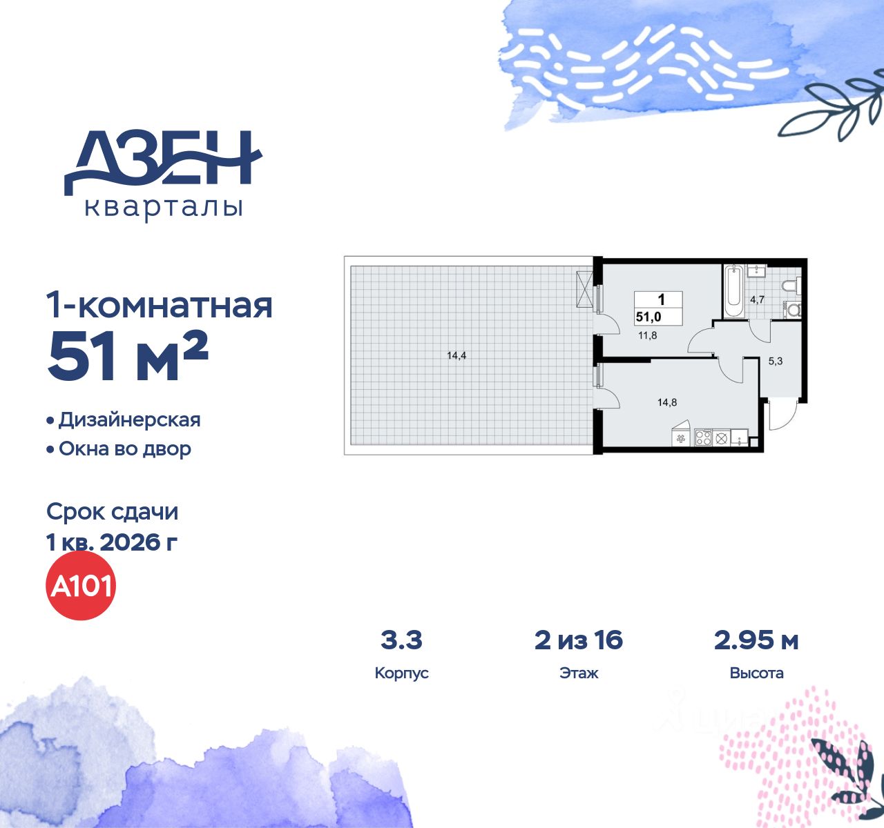 Продается однокомнатная квартира 577 в новостройке ЖК "Дзен-кварталы" по адресу Москва, ТиНАО, Новомосковский АО, Сосенское С/П, жилой комплекс Дзен-кварталы, 3.3, район Коммунарка, Новомосковский административный округ, Москва. Общая площадь квартиры - 51.00 кв. м., этаж 2 из 16, секция 8. Тип проекта, по которому построен дом - монолит, компания-застройщик - ООО "А101". Стоимость квартиры - 22028530 Р.