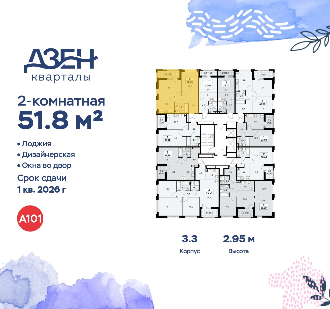 Продается двухкомнатная квартира 713 в новостройке ЖК "Дзен-кварталы" по адресу Москва, ТиНАО, Новомосковский АО, Сосенское С/П, жилой комплекс Дзен-кварталы, 3.3, район Коммунарка, Новомосковский административный округ, Москва. Общая площадь квартиры - 51.80 кв. м., этаж 16 из 16, секция 8. Тип проекта, по которому построен дом - монолит, компания-застройщик - ООО "А101". Стоимость квартиры - 24001012 Р.