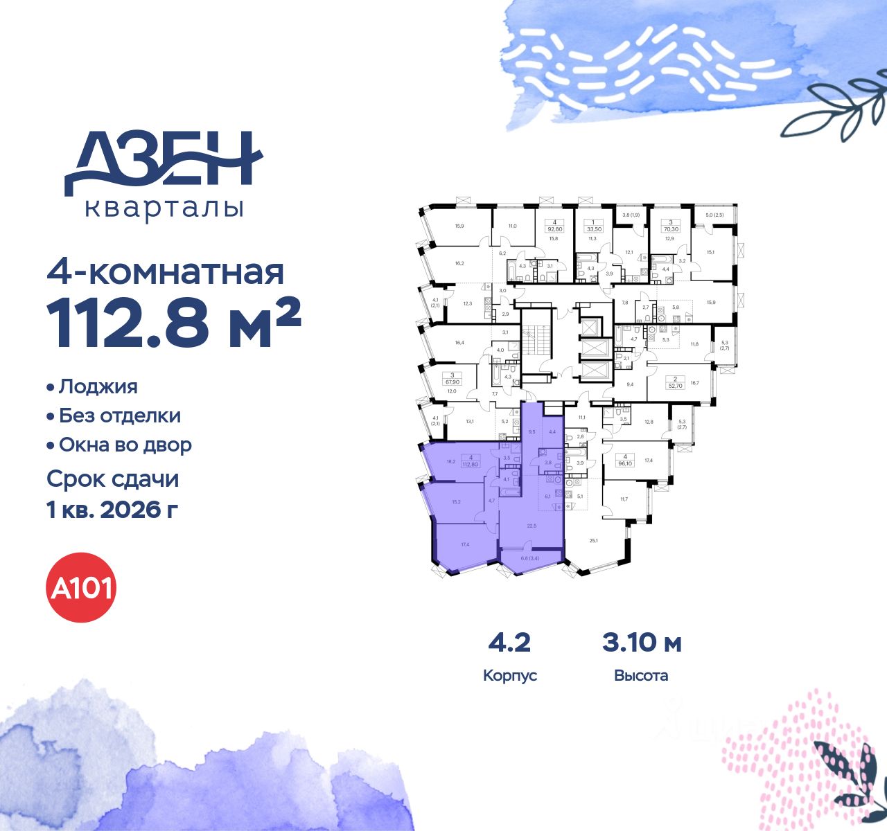 Продается четырехкомнатная квартира 242 в новостройке ЖК "Дзен-кварталы" по адресу Москва, ТиНАО, Новомосковский АО, Сосенское С/П, Москва, Новомосковский административный округ, район Коммунарка, квартал 160, 1Вк3. Общая площадь квартиры - 112.80 кв. м., этаж 18 из 21, секция 4. Тип проекта, по которому построен дом - монолит, компания-застройщик - ООО "А101". Стоимость квартиры - 38174904 Р. Срок сдачи - 1 квартал 2026.