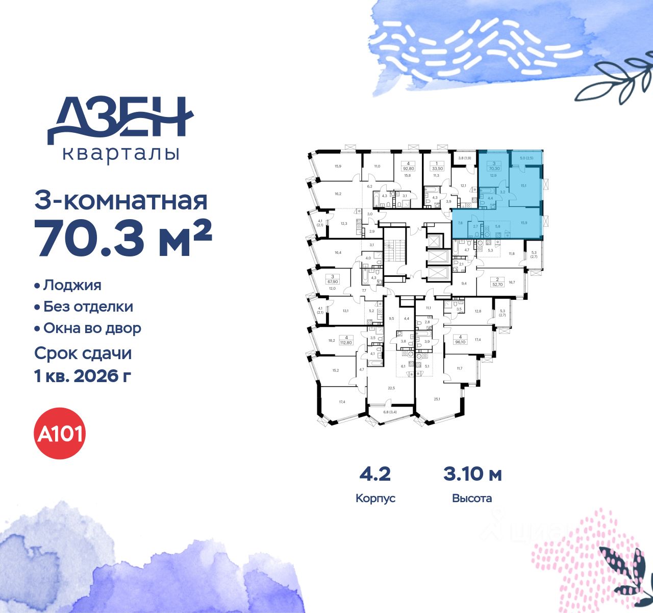 Продается трехкомнатная квартира 267 в новостройке ЖК "Дзен-кварталы" по адресу Москва, ТиНАО, Новомосковский АО, Сосенское С/П, Москва, Новомосковский административный округ, район Коммунарка, квартал 160, 1Вк3. Общая площадь квартиры - 70.30 кв. м., этаж 21 из 21, секция 4. Тип проекта, по которому построен дом - монолит, компания-застройщик - ООО "А101". Стоимость квартиры - 25239106 Р. Срок сдачи - 1 квартал 2026.