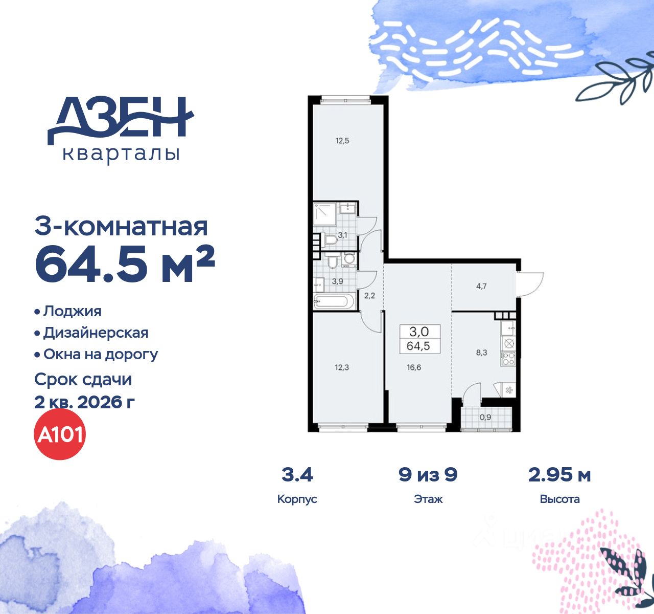 Продается трехкомнатная квартира 870 в новостройке ЖК "Дзен-кварталы" по адресу Москва, ТиНАО, Новомосковский АО, Сосенское С/П, жилой комплекс Дзен-кварталы, 3.4, район Коммунарка, Новомосковский административный округ, Москва. Общая площадь квартиры - 64.50 кв. м., этаж 9 из 9, секция 11. Тип проекта, по которому построен дом - монолит, компания-застройщик - ООО "А101". Стоимость квартиры - 30724575 Р.