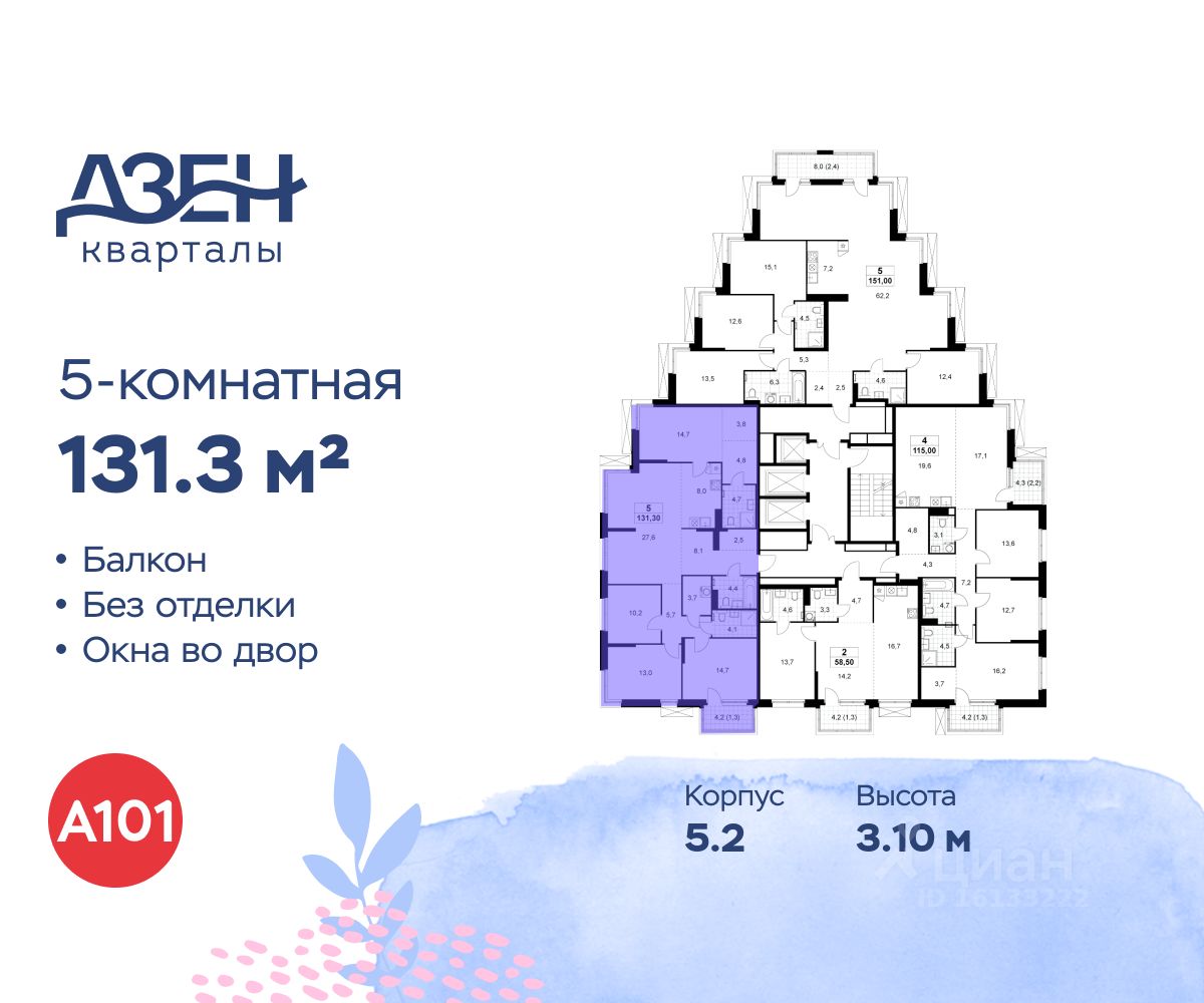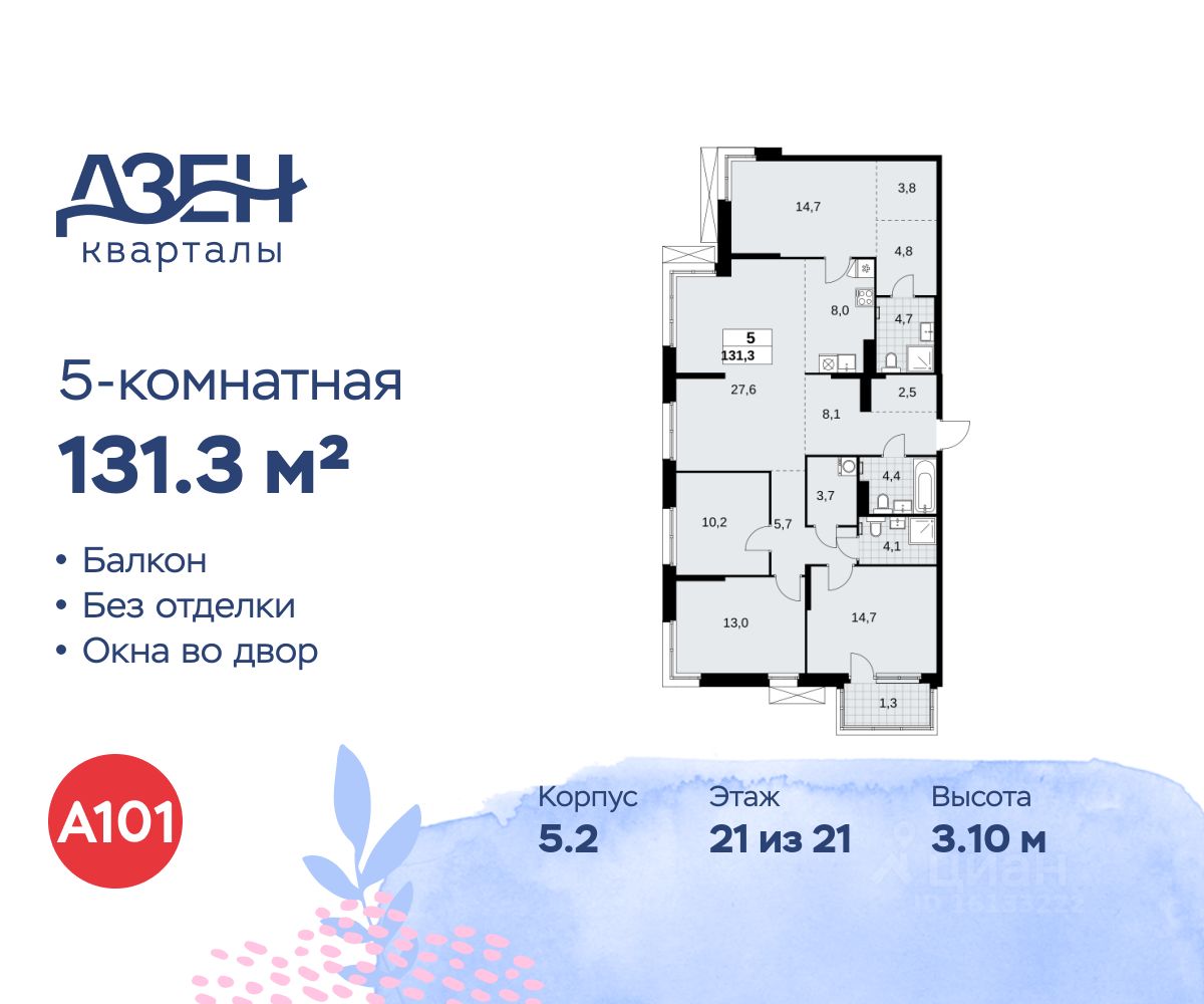 Продается многокомнатная квартира 278 в новостройке ЖК "Дзен-кварталы" по адресу Москва, ТиНАО, Новомосковский АО, Сосенское С/П, Москва, Новомосковский административный округ, район Коммунарка, квартал 160, 1Вк3. Общая площадь квартиры - 131.30 кв. м., этаж 21 из 21, секция 5. Тип проекта, по которому построен дом - монолит, компания-застройщик - ООО "А101". Стоимость квартиры - 42973177 Р. Срок сдачи - 4 квартал 2027.