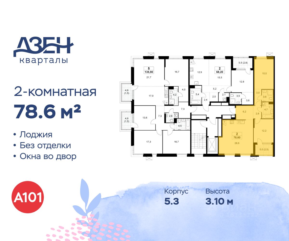 Продается двухкомнатная квартира 296 в новостройке ЖК "Дзен-кварталы" по адресу Москва, ТиНАО, Новомосковский АО, Сосенское С/П, Москва, Новомосковский административный округ, район Коммунарка, квартал 160, 1Вк3. Общая площадь квартиры - 78.60 кв. м., этаж 7 из 8, секция 6. Тип проекта, по которому построен дом - монолит, компания-застройщик - ООО "А101". Стоимость квартиры - 25842894 Р. Срок сдачи - 4 квартал 2027.