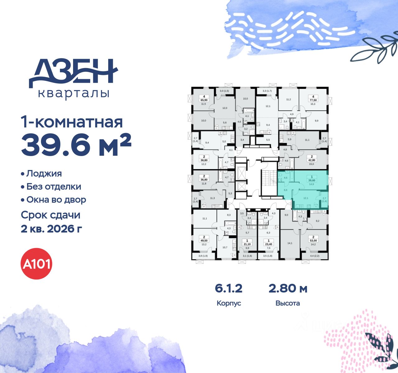 Продается однокомнатная квартира 421 в новостройке ЖК "Дзен-кварталы" по адресу Москва, ТиНАО, Новомосковский АО, Сосенское С/П, жилой комплекс Дзен-кварталы, 6.1.2, район Коммунарка, Новомосковский административный округ, Москва. Общая площадь квартиры - 39.60 кв. м., этаж 17 из 18, секция 6. Тип проекта, по которому построен дом - монолит, компания-застройщик - ООО "А101". Стоимость квартиры - 17431128 Р. Срок сдачи - 2 квартал 2026.