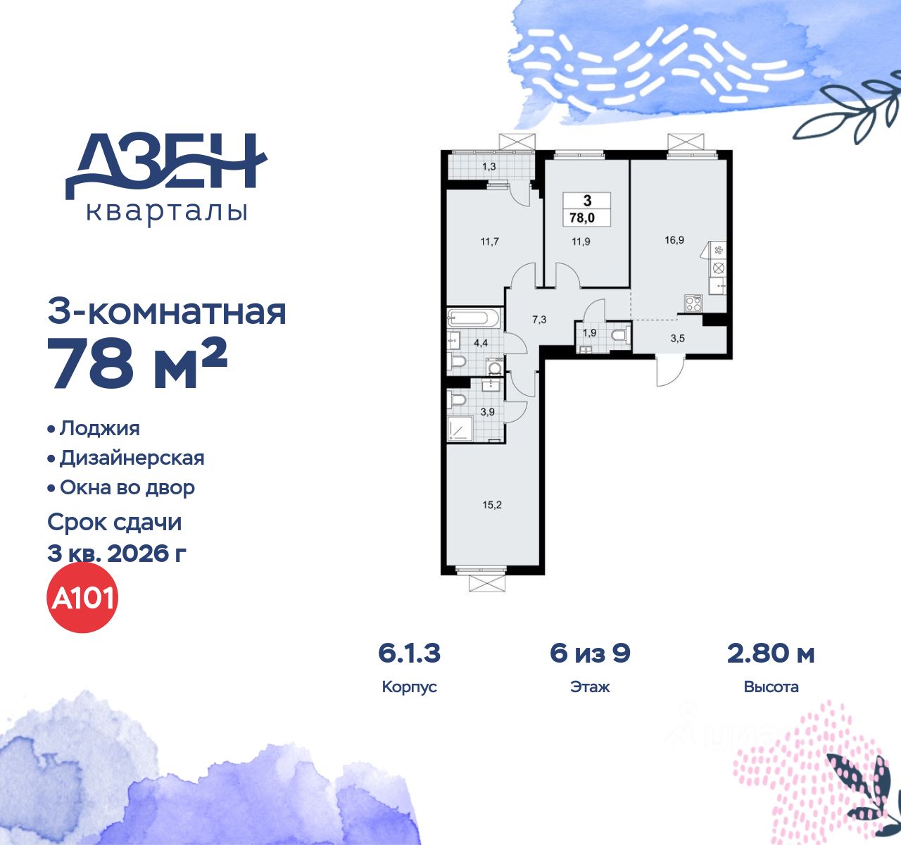 Продается трехкомнатная квартира 604 в новостройке ЖК "Дзен-кварталы" по адресу Москва, ТиНАО, Новомосковский АО, Сосенское С/П, жилой комплекс Дзен-кварталы, 6.1.3, район Коммунарка, Новомосковский административный округ, Москва. Общая площадь квартиры - 78.00 кв. м., этаж 6 из 9, секция 9. Тип проекта, по которому построен дом - монолит, компания-застройщик - ООО "А101". Стоимость квартиры - 32408220 Р. Срок сдачи - 3 квартал 2026.
