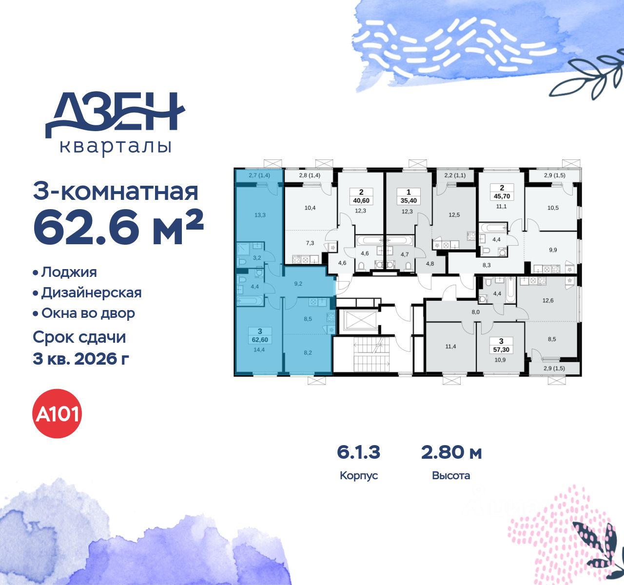 Продается трехкомнатная квартира 710 в новостройке ЖК "Дзен-кварталы" по адресу Москва, ТиНАО, Новомосковский АО, Сосенское С/П, жилой комплекс Дзен-кварталы, 6.1.3, район Коммунарка, Новомосковский административный округ, Москва. Общая площадь квартиры - 62.60 кв. м., этаж 9 из 9, секция 11. Тип проекта, по которому построен дом - монолит, компания-застройщик - ООО "А101". Стоимость квартиры - 26098566 Р. Срок сдачи - 3 квартал 2026.