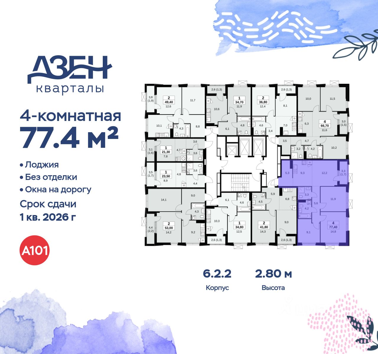 Продается четырехкомнатная квартира 490 в новостройке ЖК "Дзен-кварталы" по адресу Москва, ТиНАО, Новомосковский АО, Сосенское С/П, жилой комплекс Дзен-кварталы, 6.2.2. Общая площадь квартиры - 77.40 кв. м., этаж 19 из 23, секция 7. Тип проекта, по которому построен дом - монолит, компания-застройщик - ООО "А101". Стоимость квартиры - 26447580 Р. Срок сдачи - 1 квартал 2026.