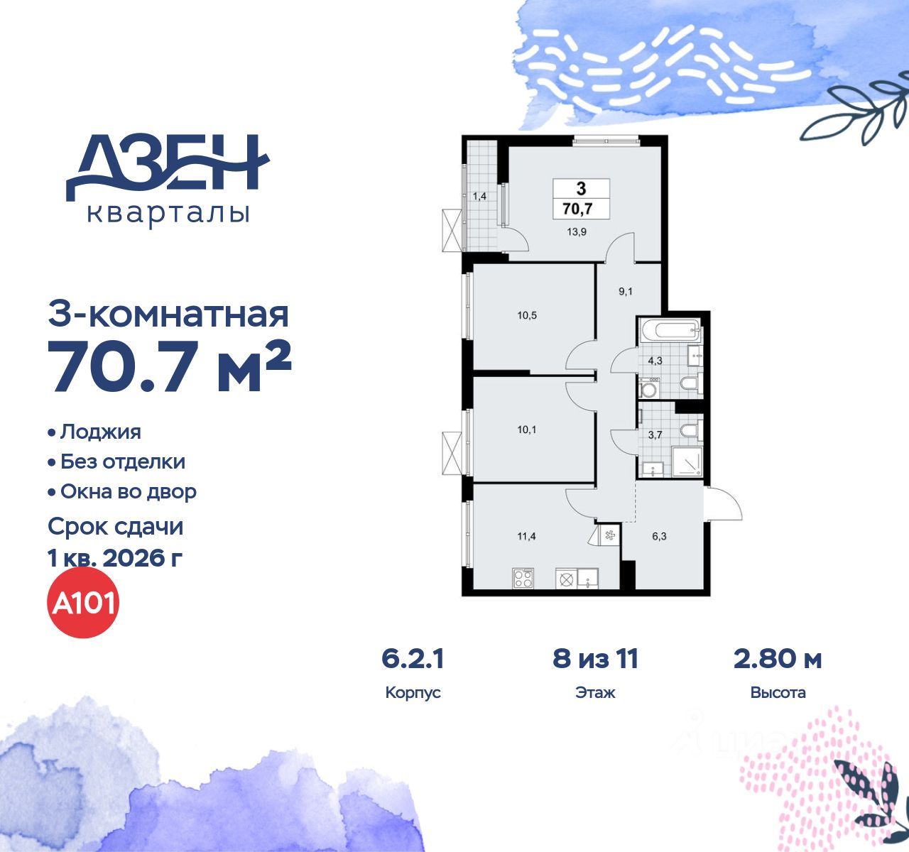 Продается трехкомнатная квартира 186 в новостройке ЖК "Дзен-кварталы" по адресу Москва, ТиНАО, Новомосковский АО, Сосенское С/П, жилой комплекс Дзен-кварталы, 6.2.1, район Коммунарка, Новомосковский административный округ, Москва. Общая площадь квартиры - 70.70 кв. м., этаж 8 из 11, секция 4. Тип проекта, по которому построен дом - монолит, компания-застройщик - ООО "А101". Стоимость квартиры - 24808630 Р. Срок сдачи - 1 квартал 2026.