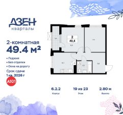 Продается двухкомнатная квартира 486 в новостройке ЖК "Дзен-кварталы" по адресу Москва, ТиНАО, Новомосковский АО, Сосенское С/П, жилой комплекс Дзен-кварталы, 6.2.2. Общая площадь квартиры - 49.40 кв. м., этаж 19 из 23, секция 7. Тип проекта, по которому построен дом - монолит, компания-застройщик - ООО "А101". Стоимость квартиры - 19777290 Р. Срок сдачи - 1 квартал 2026.