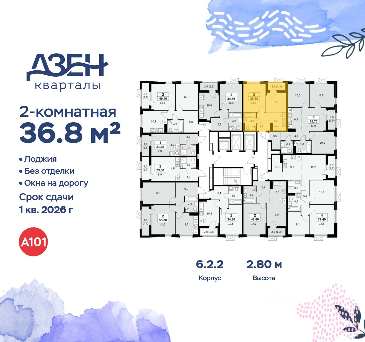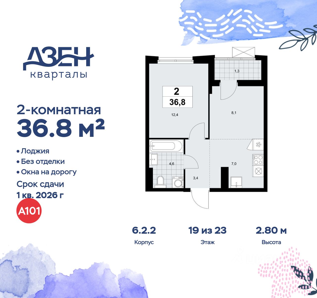 Продается двухкомнатная квартира 488 в новостройке ЖК "Дзен-кварталы" по адресу Москва, ТиНАО, Новомосковский АО, Сосенское С/П, жилой комплекс Дзен-кварталы, 6.2.2. Общая площадь квартиры - 36.80 кв. м., этаж 19 из 23, секция 7. Тип проекта, по которому построен дом - монолит, компания-застройщик - ООО "А101". Стоимость квартиры - 18237712 Р. Срок сдачи - 1 квартал 2026.