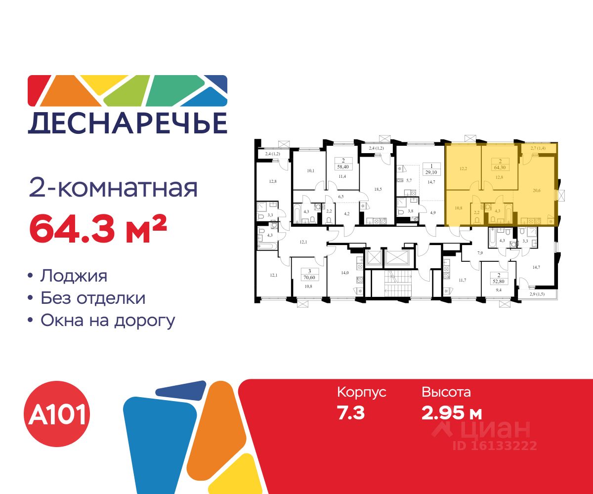 Продается двухкомнатная квартира 868 в новостройке ЖК "Деснаречье" по адресу Москва, ТиНАО, Новомосковский АО, Десеновское С/П, Десна деревня, Москва, район Троицк, ЖК Деснаречье, к. 7.3. Общая площадь квартиры - 64.30 кв. м., этаж 16 из 16, секция 14. Тип проекта, по которому построен дом - монолит, компания-застройщик - ООО "А101". Стоимость квартиры - 22930666 Р. Срок сдачи - 3 квартал 2027.